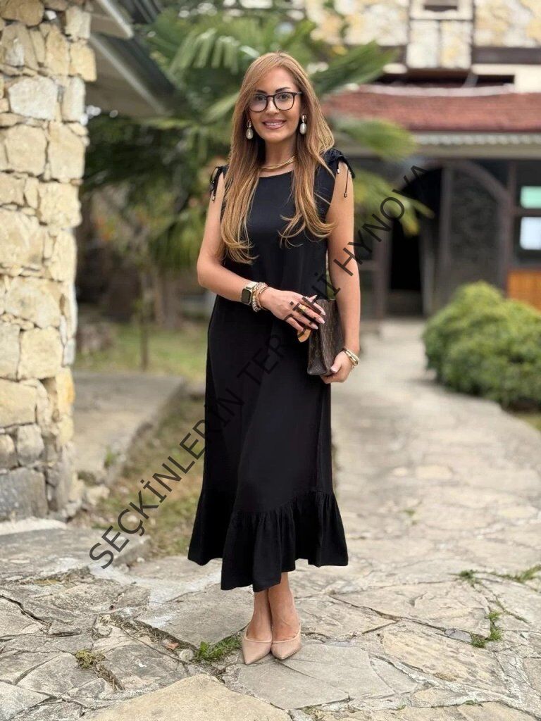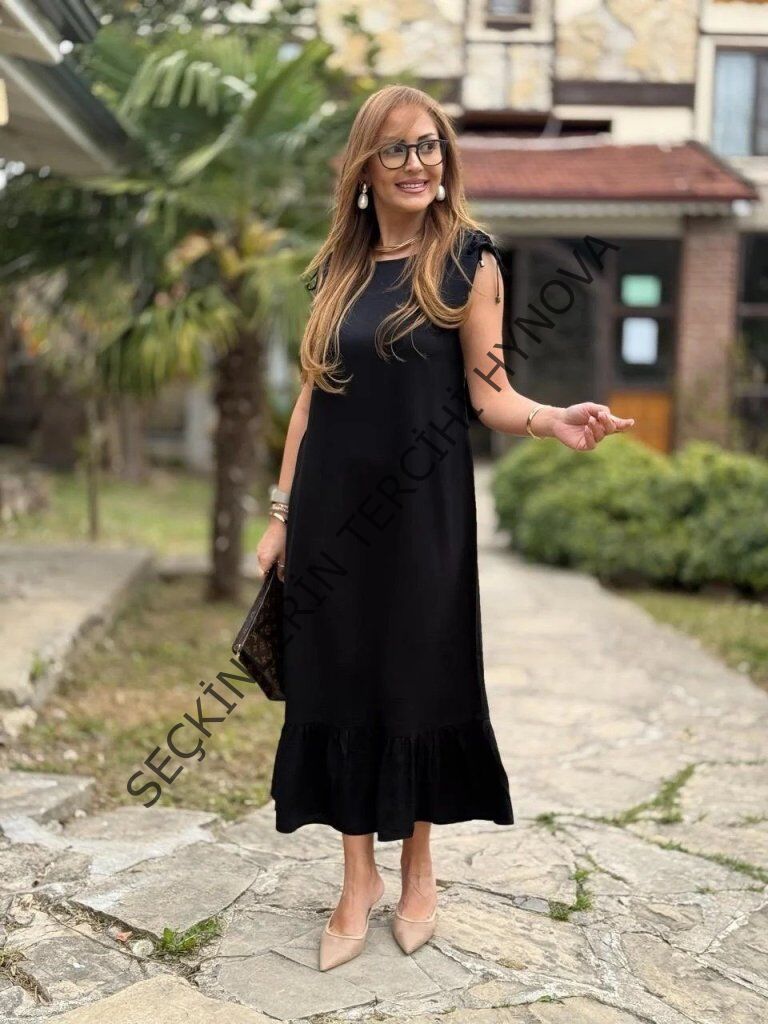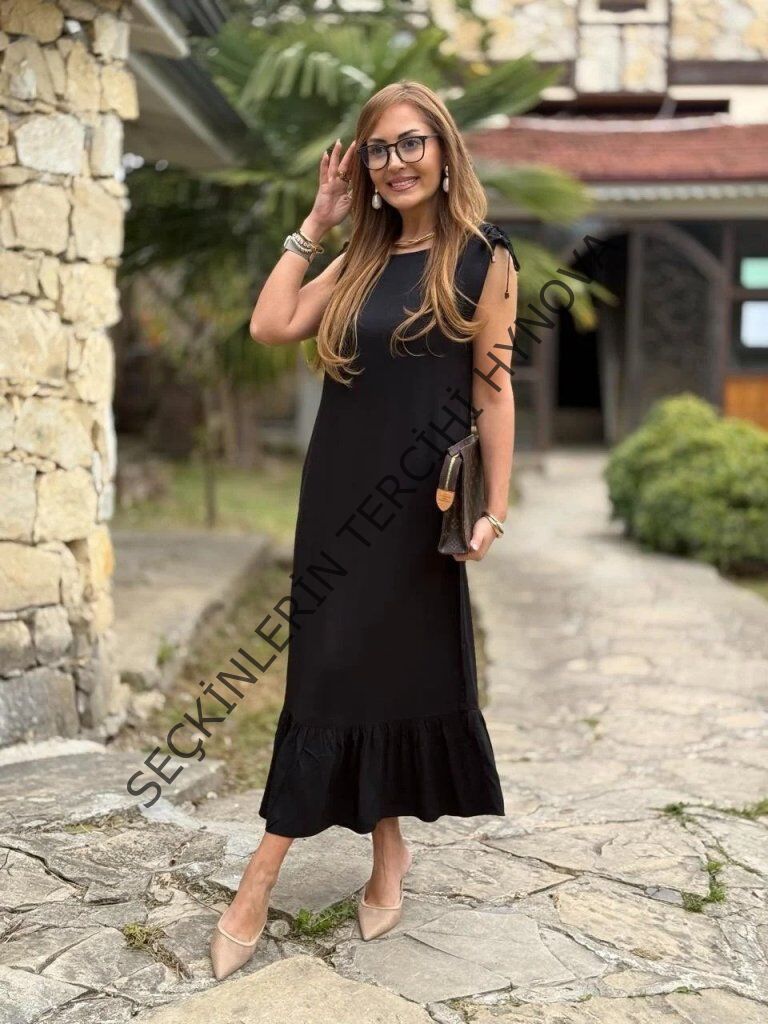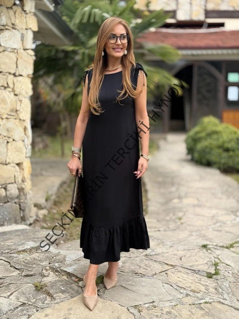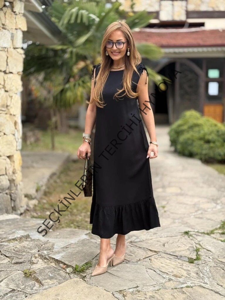 Kadın Omuzlardan Büzgülü Kayık Yaka Fırfırlı Janjan Krep Elbise