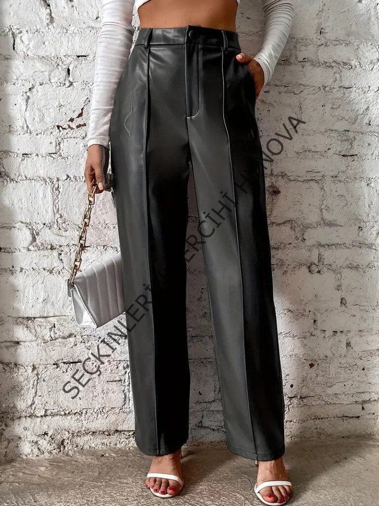 Kadın önden Fermuarlı Cepli Geniş Kesim Lame Deri Pantolon