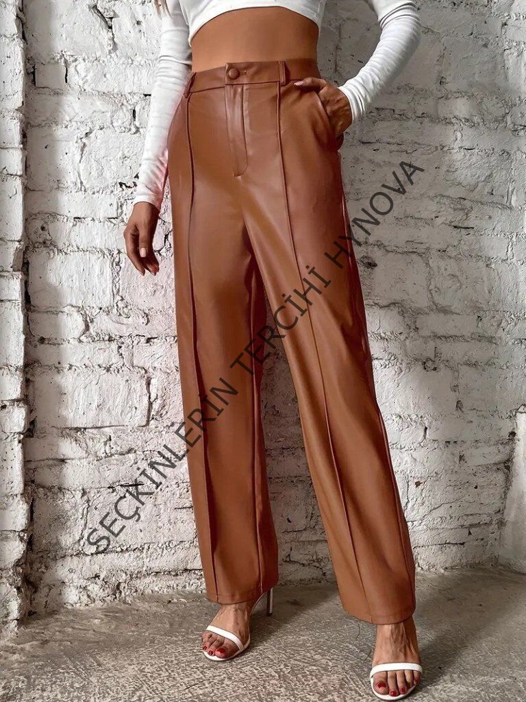 Kadın önden Fermuarlı Cepli Geniş Kesim Lame Deri Pantolon
