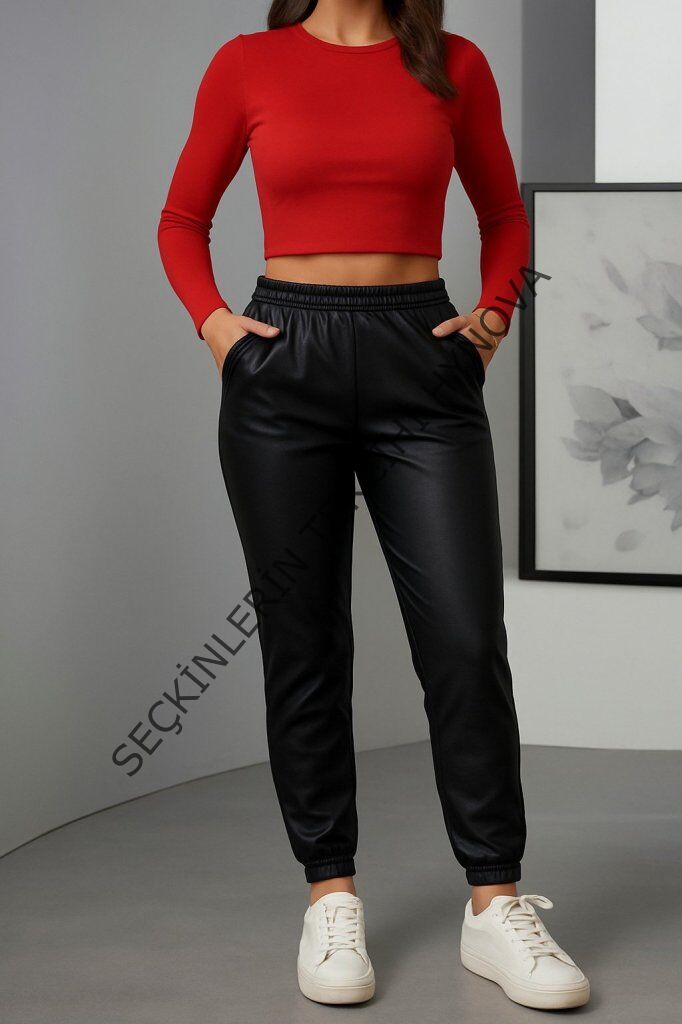 Kadın Paçası Lastikli Cep Detaylı Deri Tayt