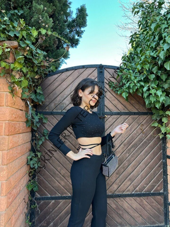 Kadın Paçası Yırtmaç Detaylı Taşlı Bel Bağlamalı Kaşkorse İkili Takım