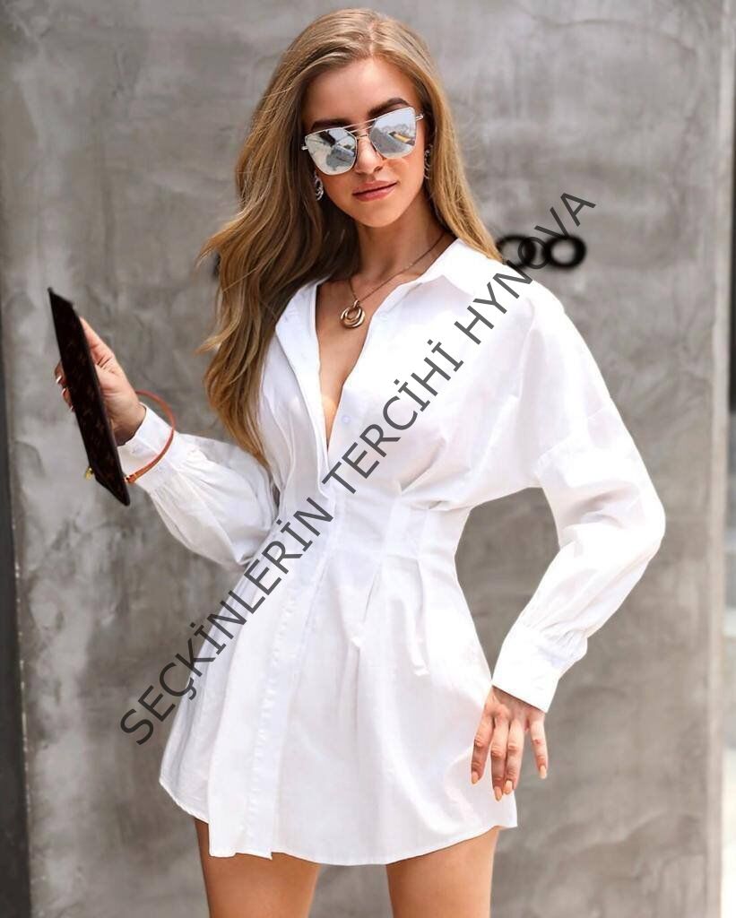 Kadın Pamuk Polyester Kumaş Belden Pileli Gömlek Elbise