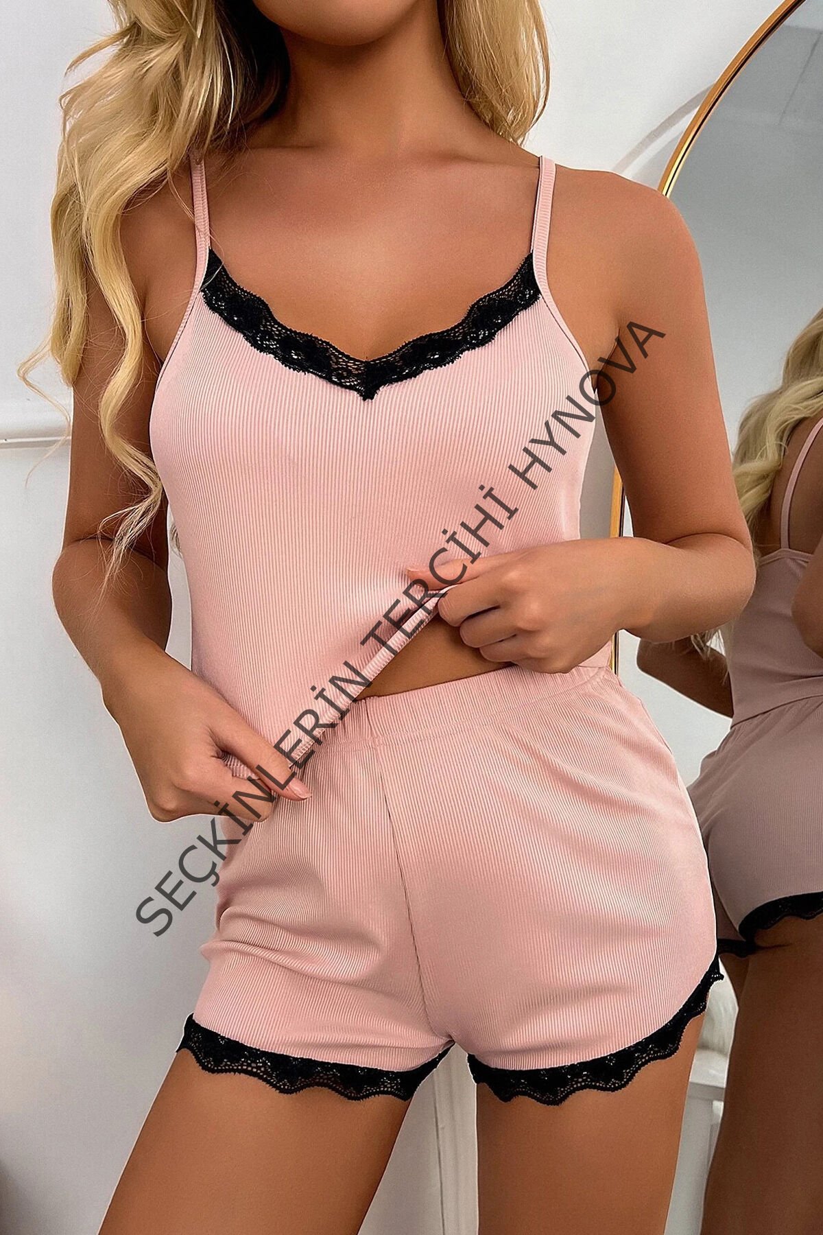Kadın Pembe Alt Ve Üst Dantel Detaylı Şortlu Gecelik Takımı – Modern, Konforlu ve Günlük Kombinlere Uygun