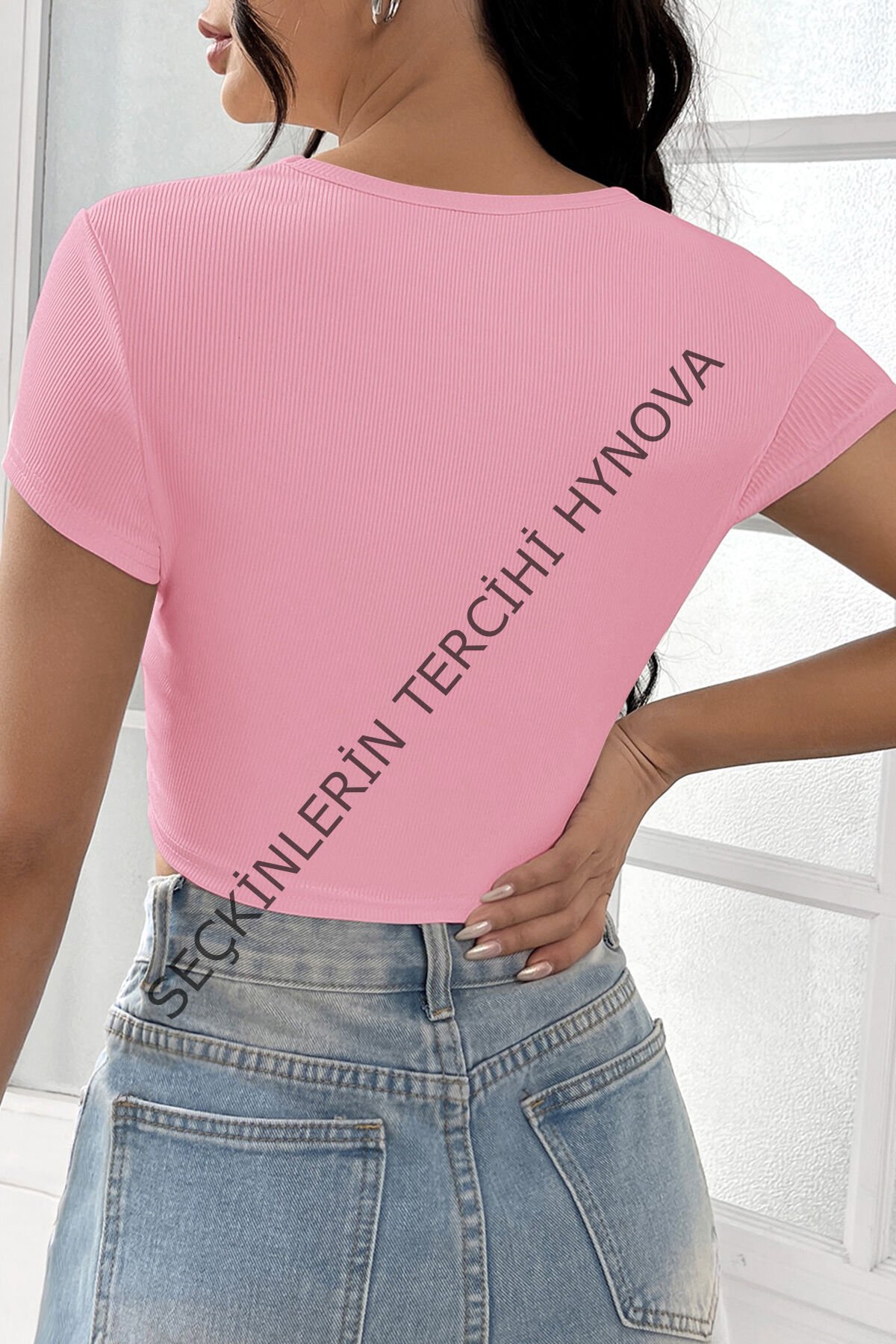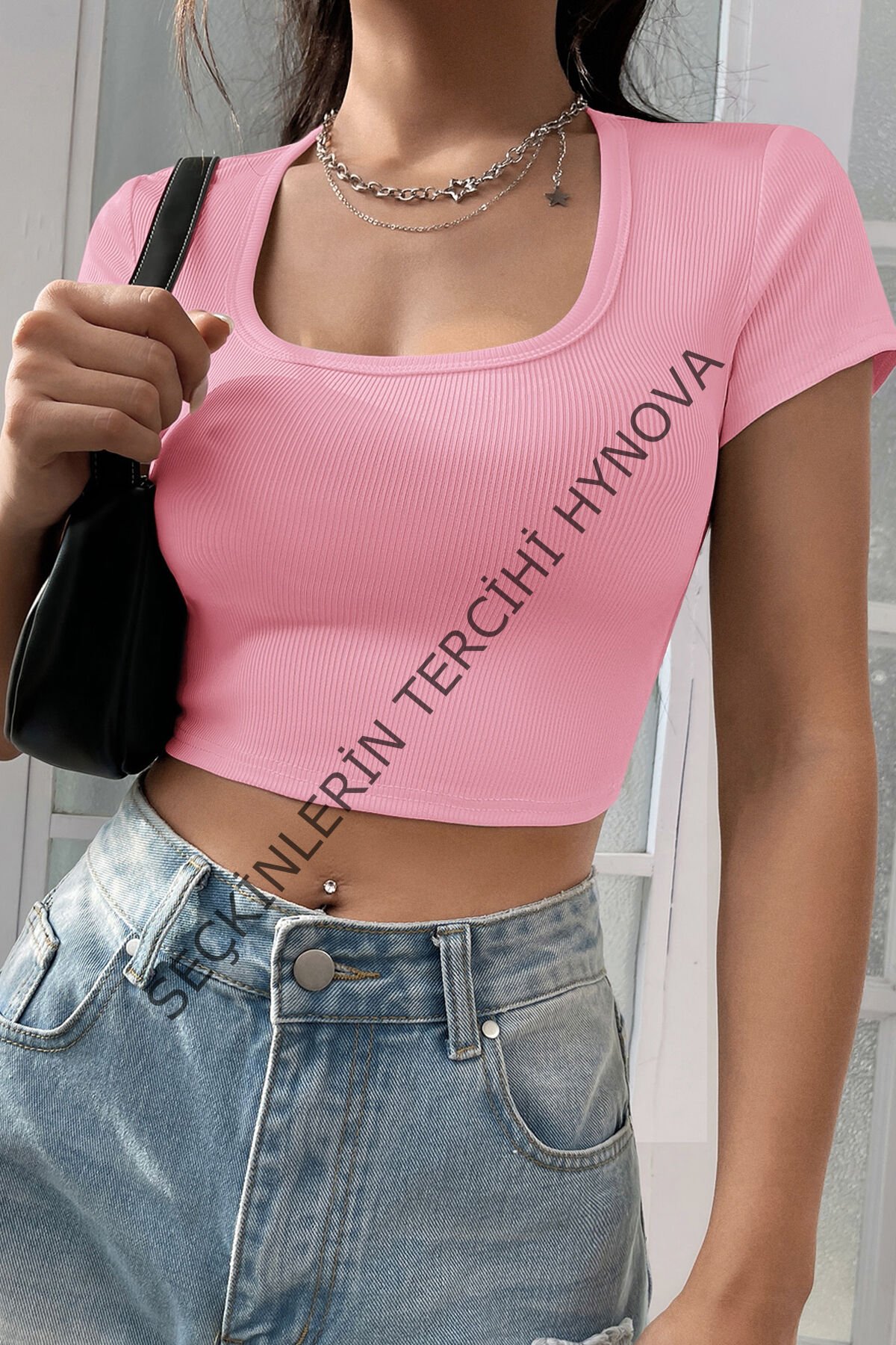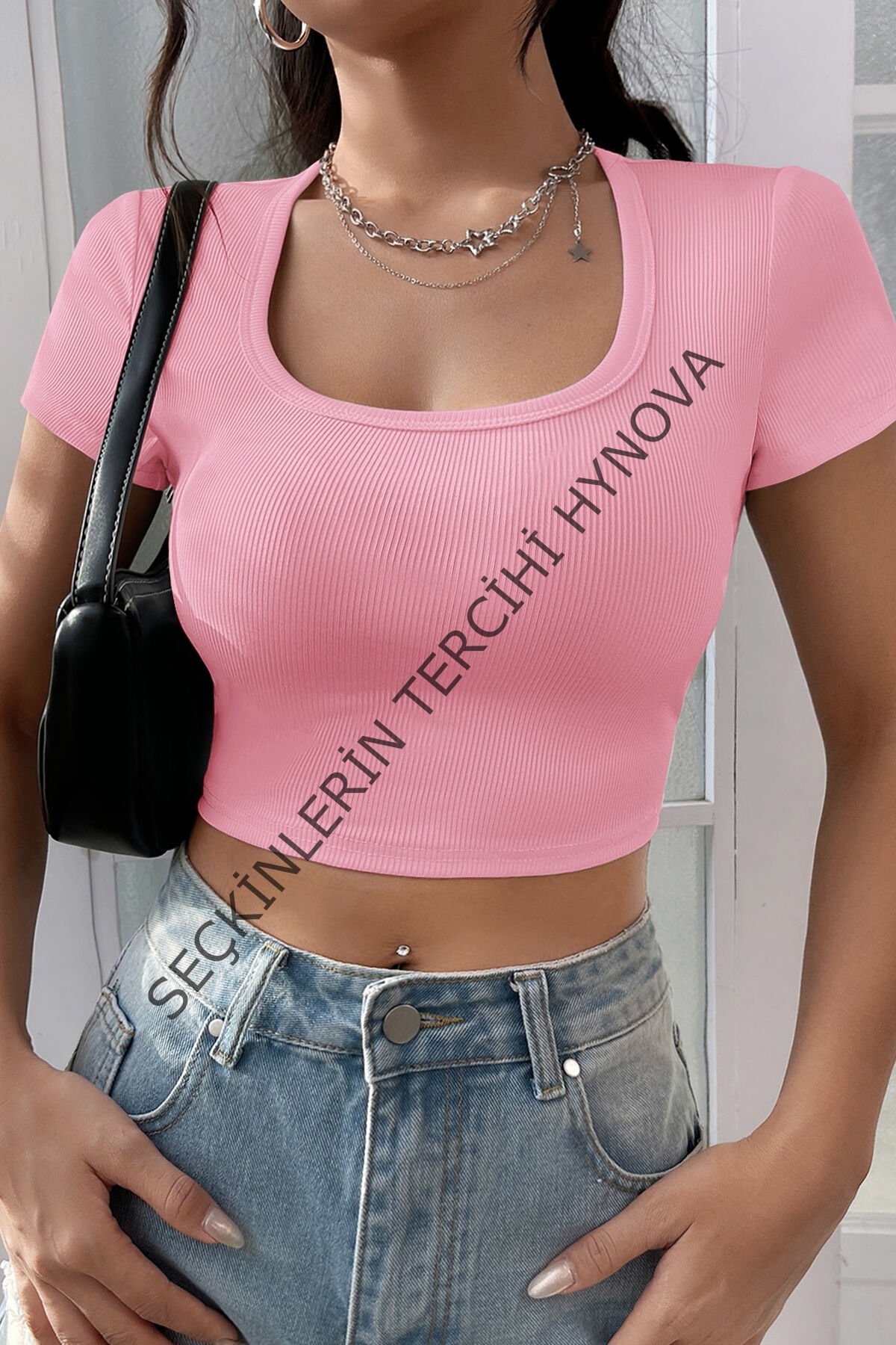 Kadın Pembe Yarım Kol Düz Yaka Crop Top Bluz – Şık, Rahat ve Kolay Kombinlenebilir