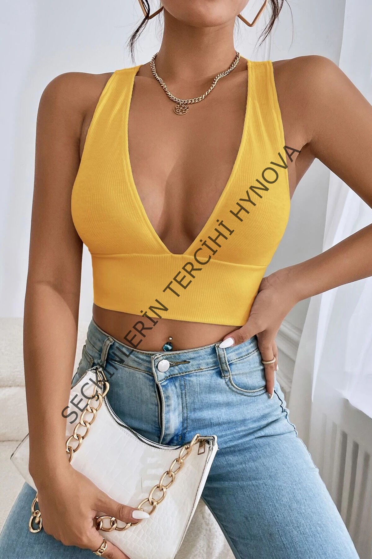 Kadın Sarı Çapraz Sırt Detaylı Şık Crop Top Büstiyer – Modern ve Şık Tasarım