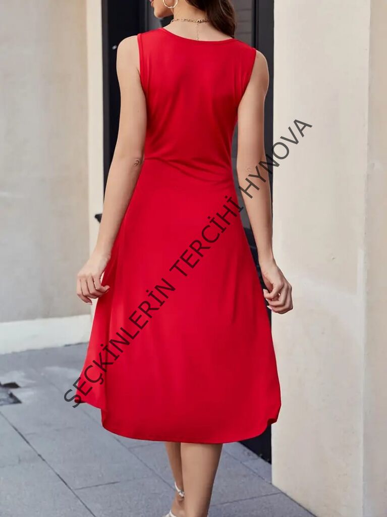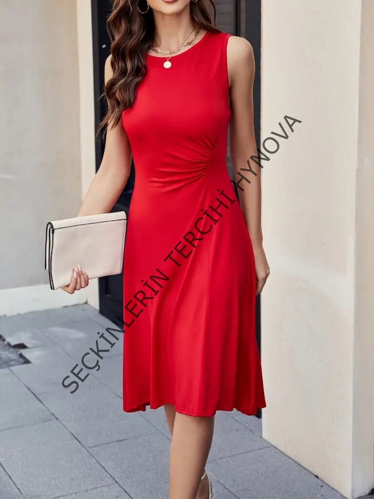 Kadın Sıfır Kol Bisiklet Yaka Bel Büzgü Detay Viskon Elbise