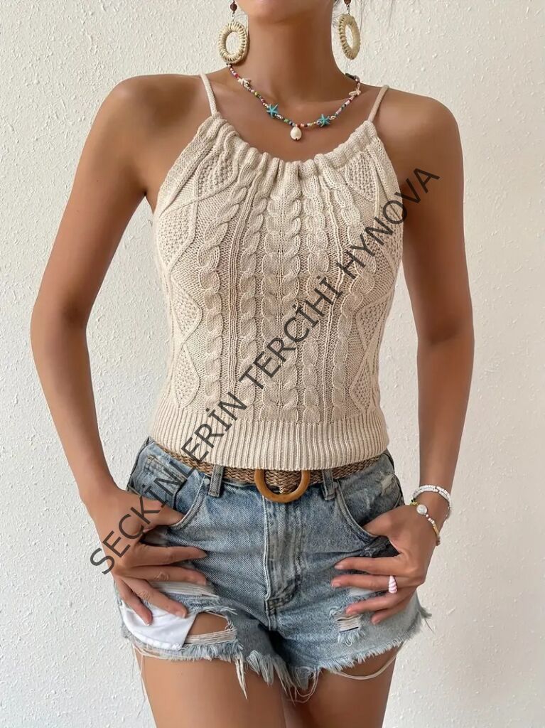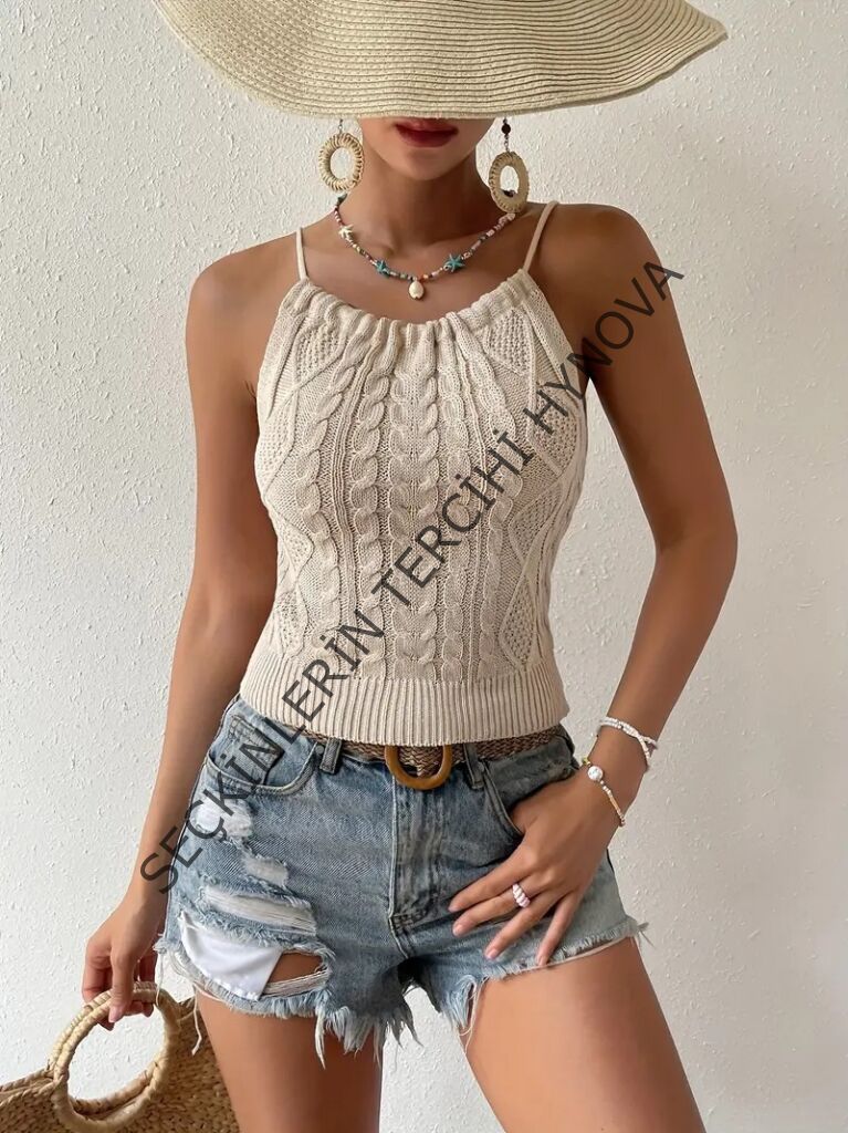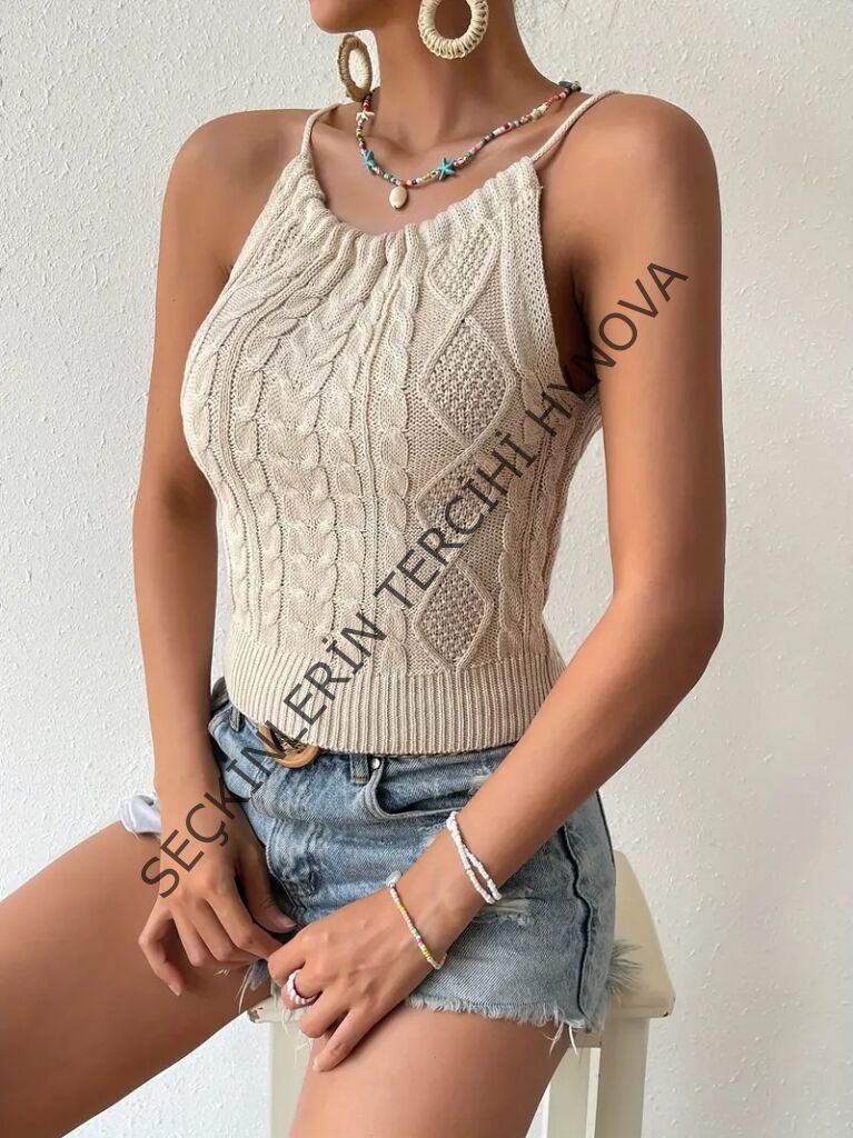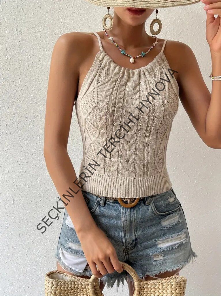 Kadın Sıfır Kol Boyun Bağlama Detay Sırt Dekolte Triko Bluz