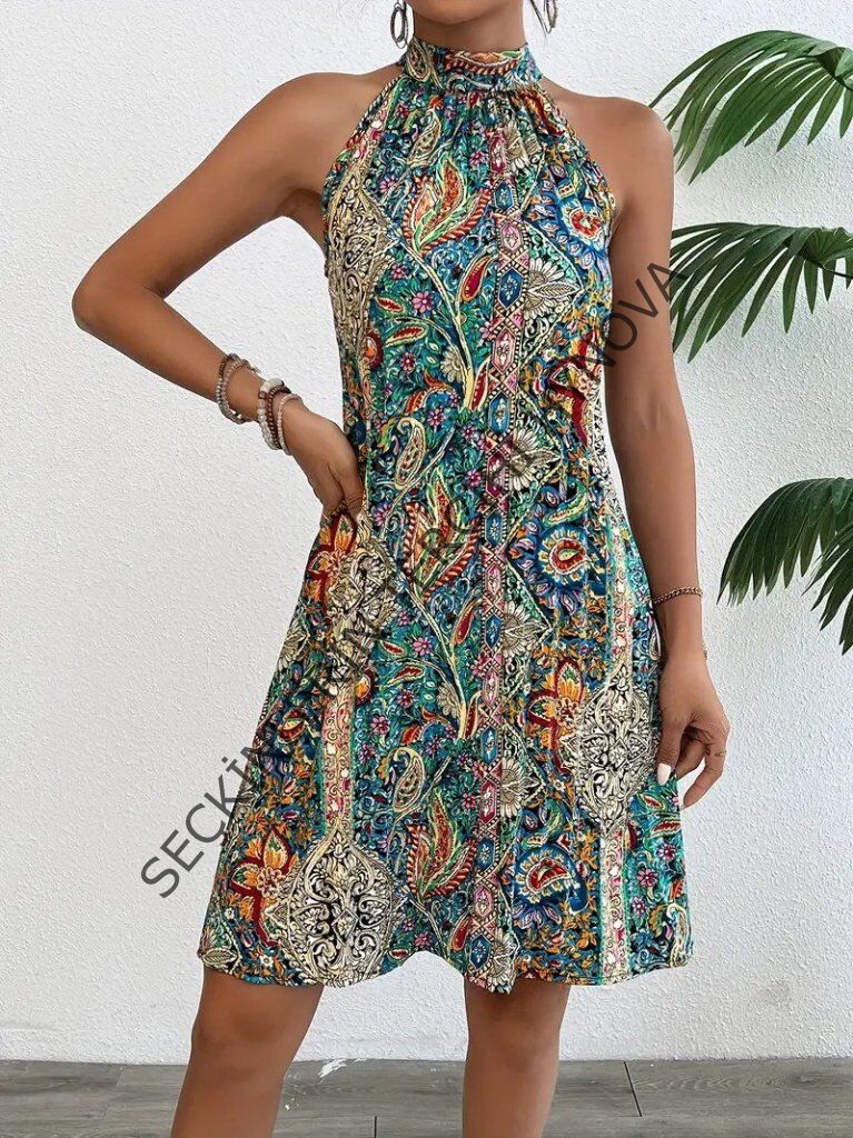 Kadın Sıfır Kol Boyundan Askılı Desenli Midi Süprem Elbise