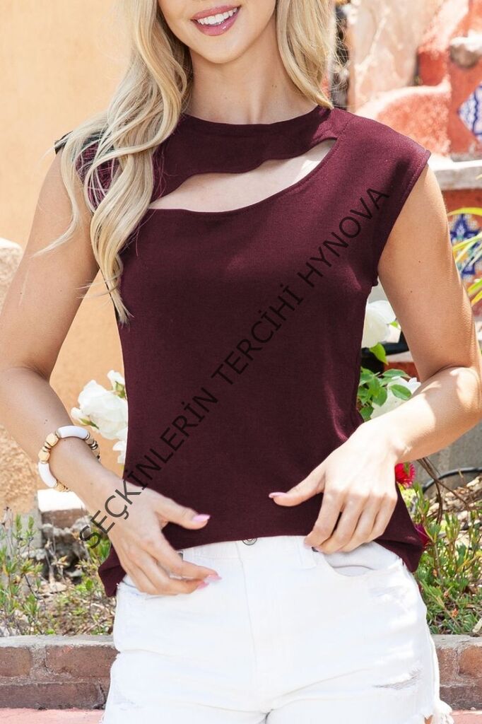 Kadın Sıfır Kol Pencere Detay Viskon T-shirt