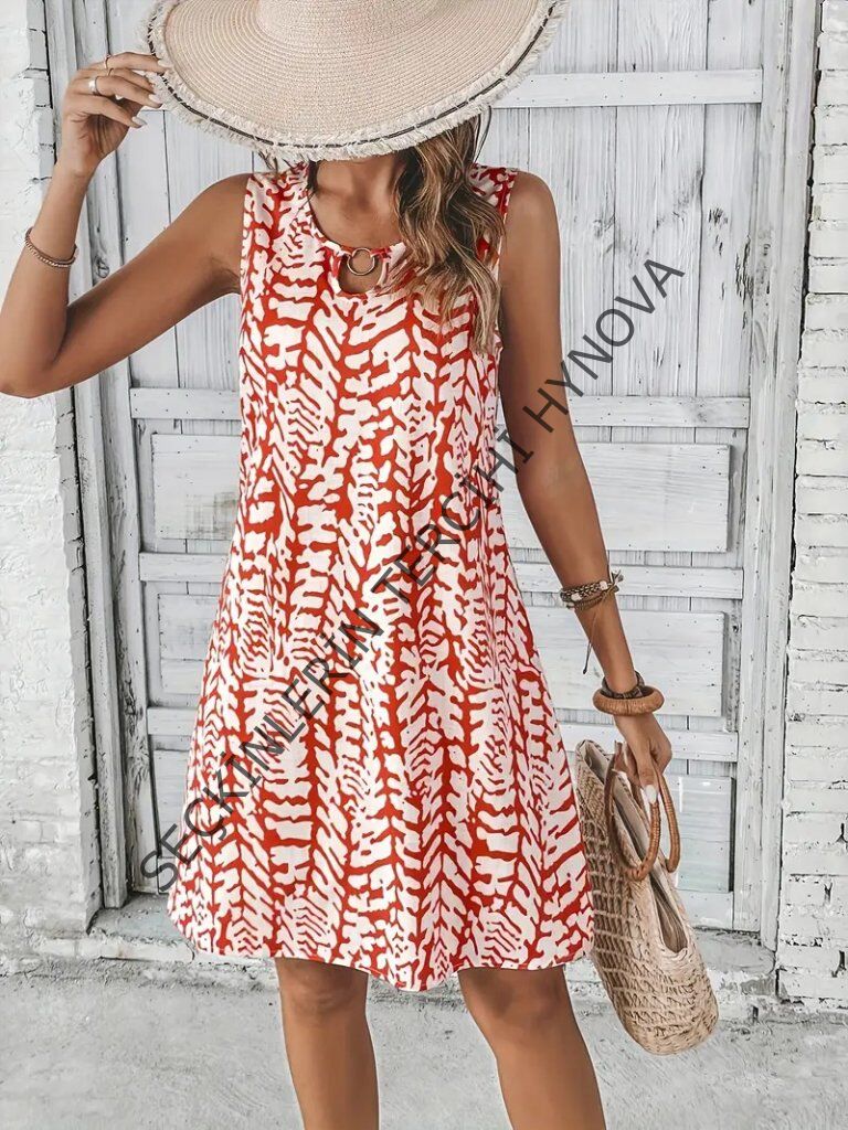 Kadın Sıfır Kol Yakadan Halka Detaylı Desenli Kısa Bürümcük Elbise