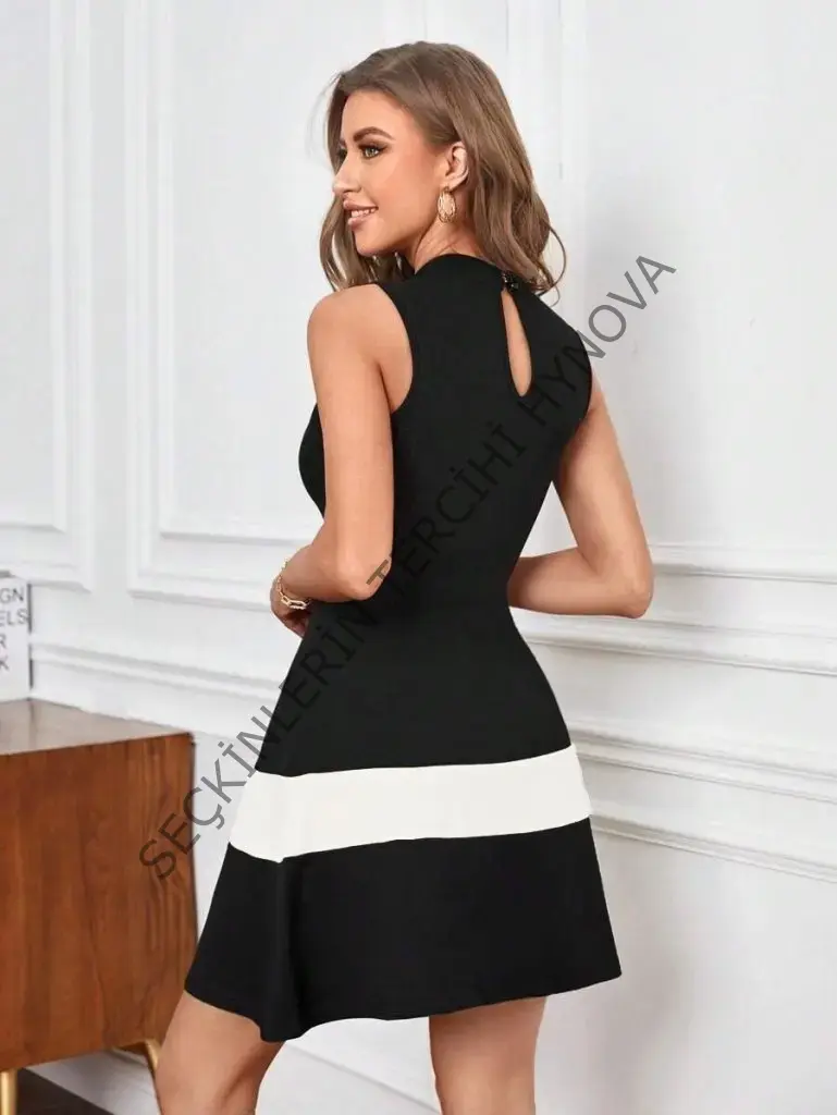 Kadın Sıfır Kol Yarı Balıkçı Yaka şerit Detaylı Ithal Krep Elbise