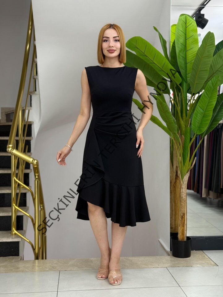 Kadın Sıfır Kollu Belden Büzgülü Eteği Volanlı Asimetrik Kesim Midi Janjan Krep Elbise