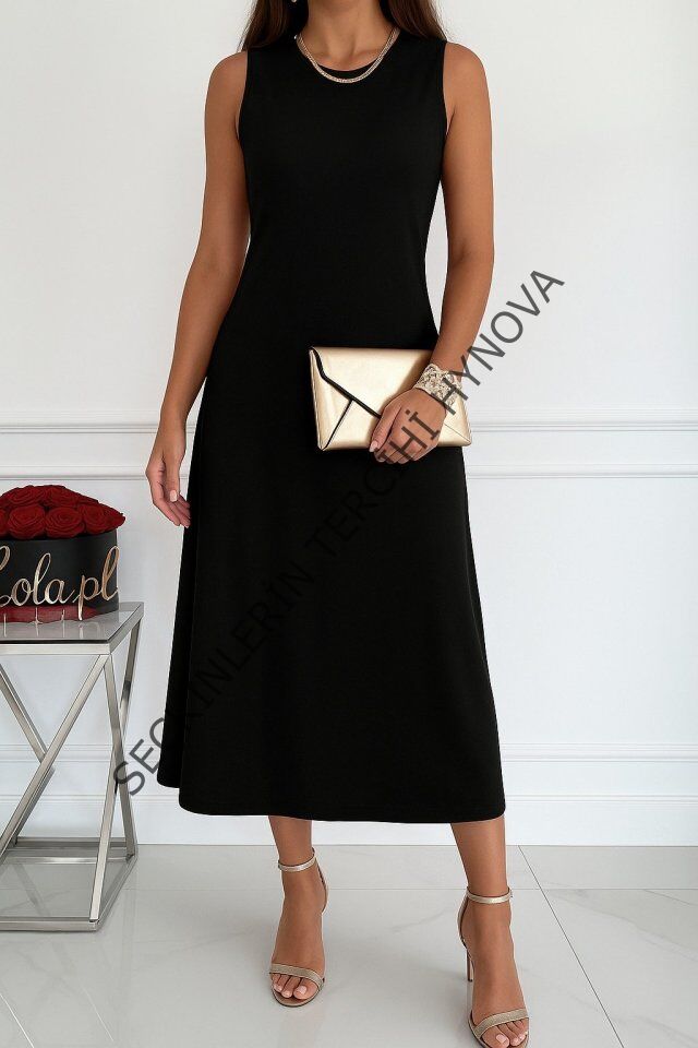 Kadın Sıfır Kollu Bisiklet Yaka Midi Viskon Iki Iplik Elbise