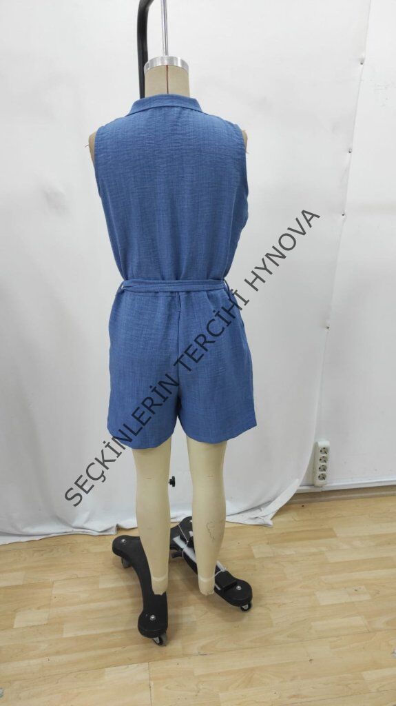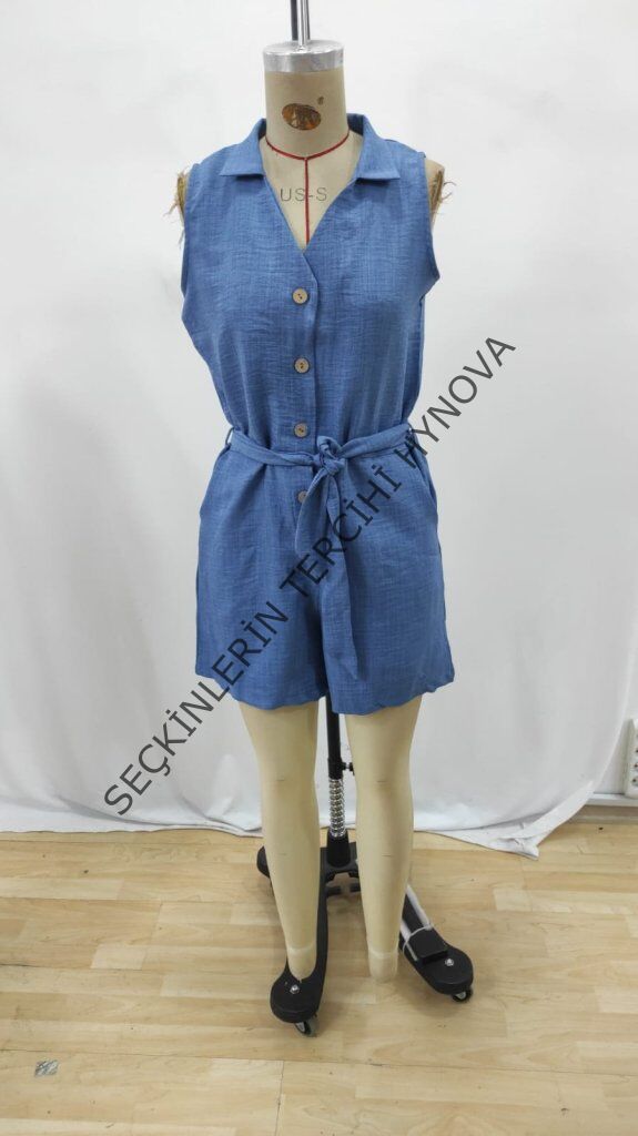 Kadın Sıfır Kollu Yakalı Düğmeli Belden Kuşaklı Kısa Keten Tulum