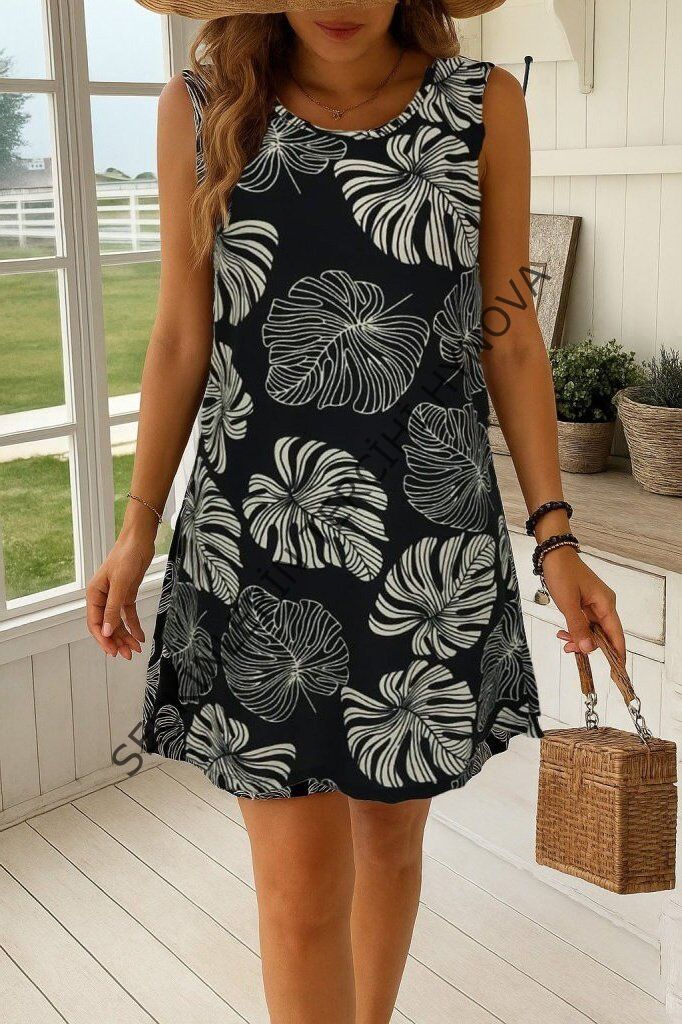 Kadın Sıfır Kollu Yuvarlak Yaka Desenli Süprem Elbise