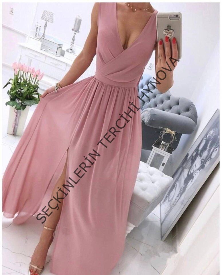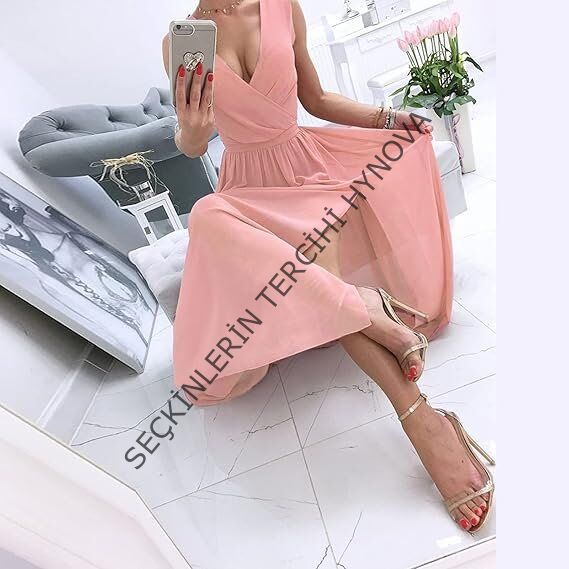 Kadın şifon Kumaş V Yaka Sıfır Kol Maxi Boy Elbise