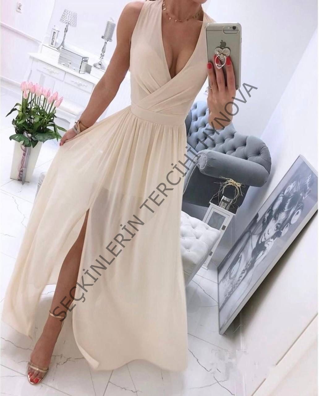 Kadın şifon Kumaş V Yaka Sıfır Kol Maxi Boy Elbise