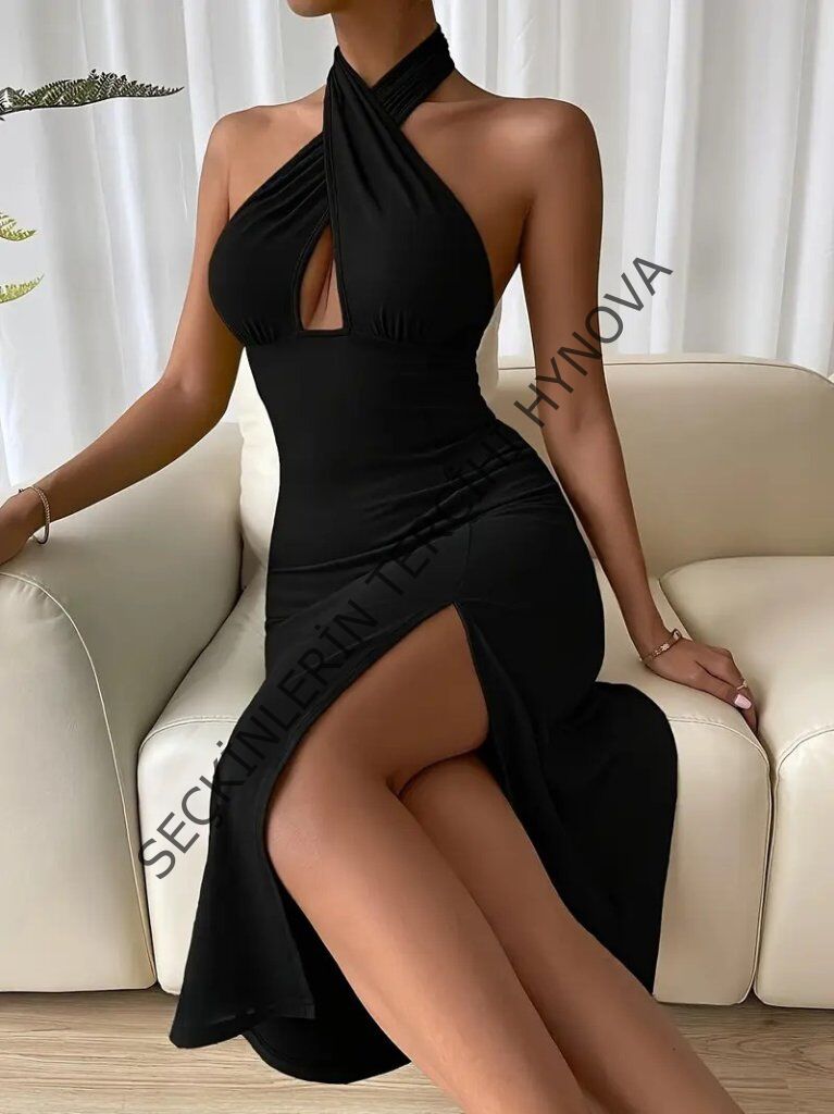 Kadın Sırt Dekolteli Boyun çapraz Yakalı Yırtmaç Detay Midi Sandy Elbise