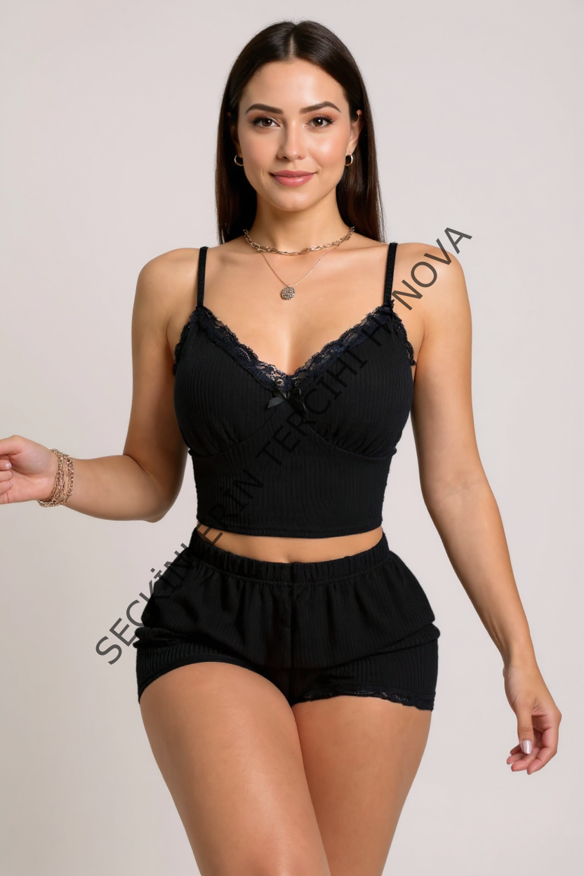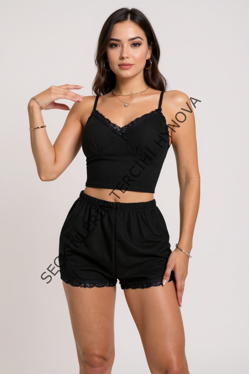 Kadın Siyah Alt ve Üst Dantel Detaylı Fiyonklu Şortlu Gecelik Takımı – Modern, Konforlu ve Günlük Kombinlere Uygun