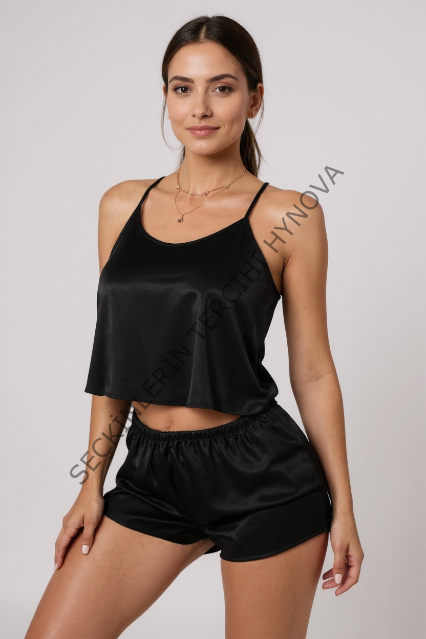 Kadın Siyah Asimetrik Sırt Dekolte Detaylı Şık Şortlu Gecelik Takım – Modern, Konforlu ve Günlük Kombinlere Uygun