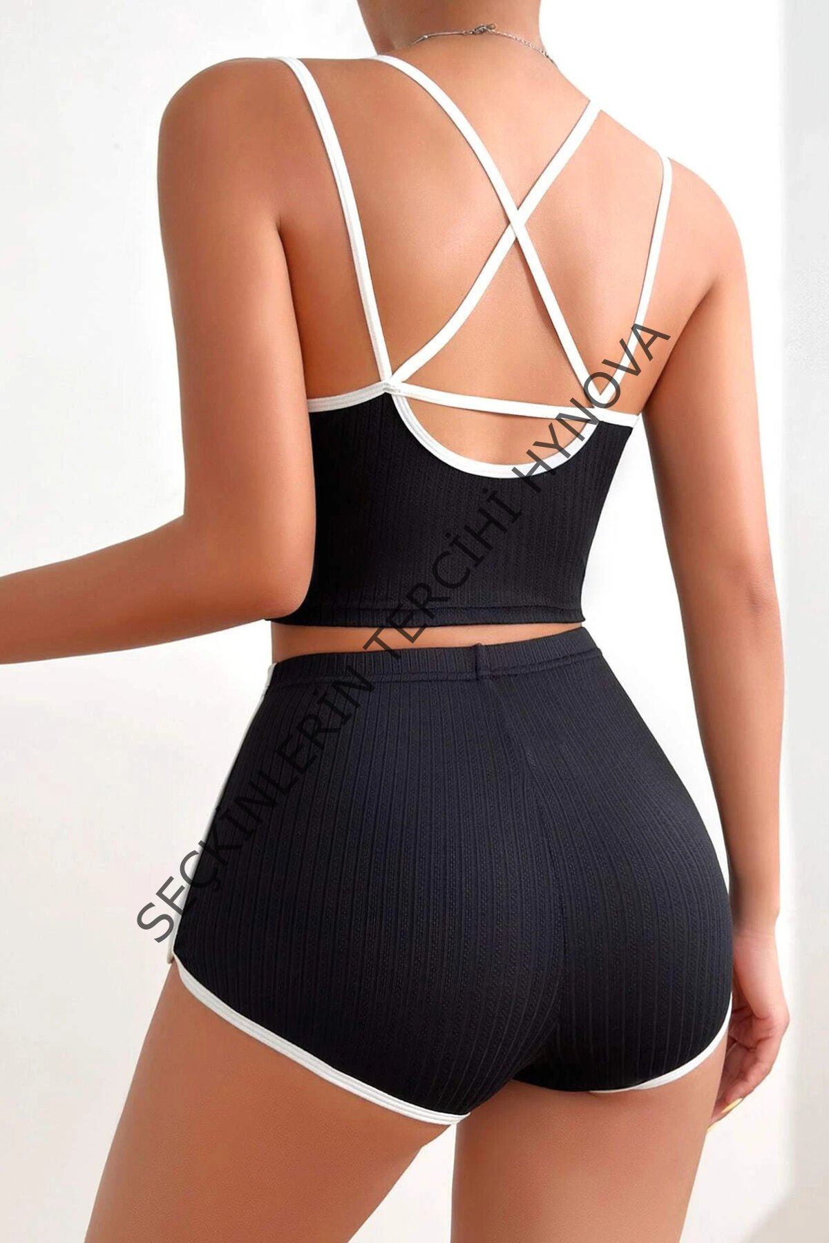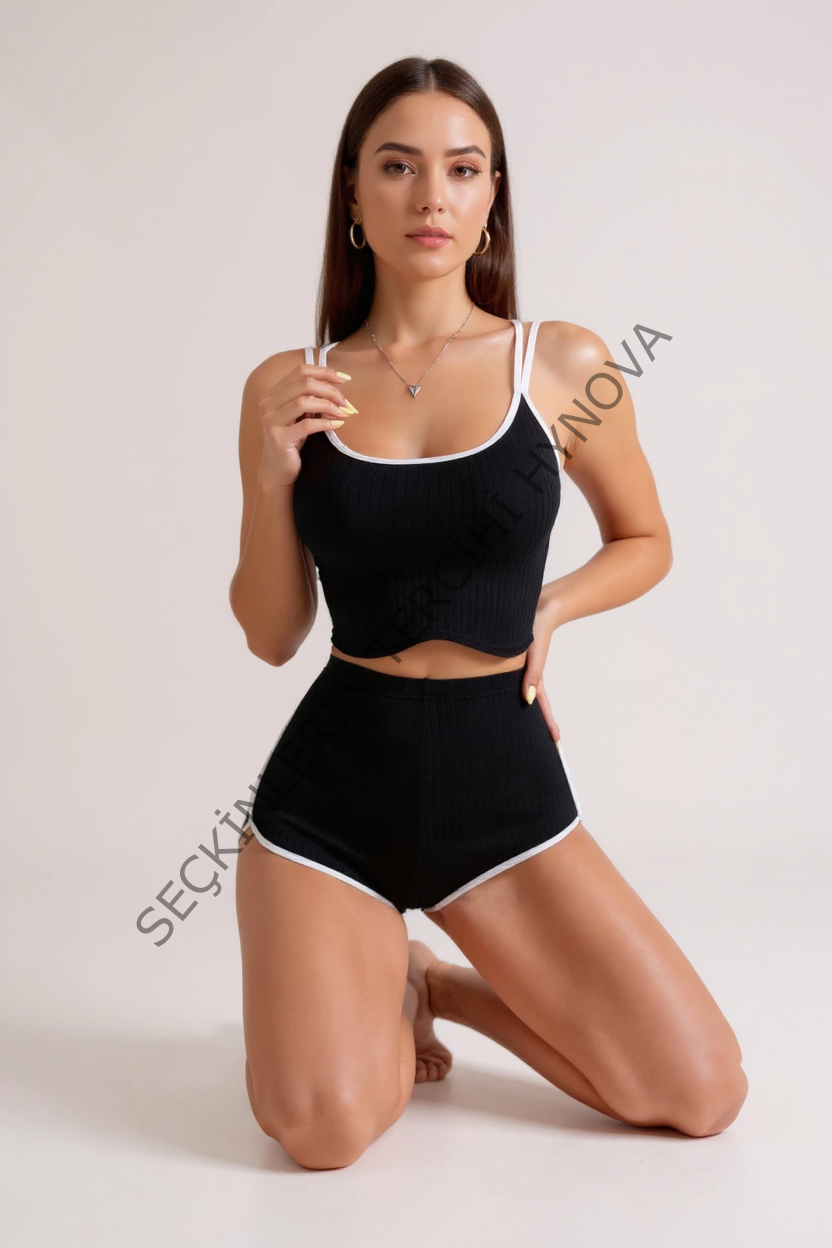 Kadın Siyah Beyaz Çapraz Lastik Detaylı Kaşkorse Şortlu Gecelik Takımı – Modern, Konforlu ve Günlük Kombinlere Uygun
