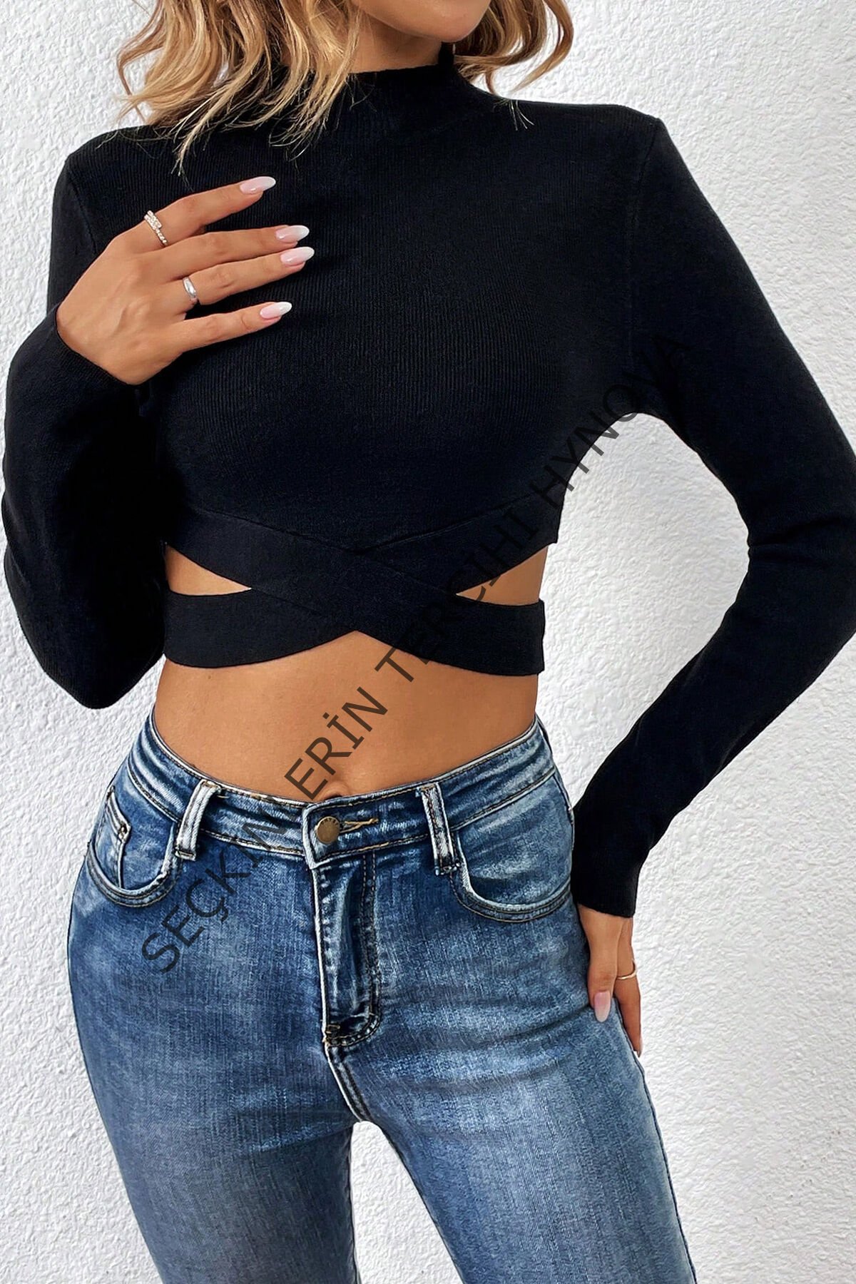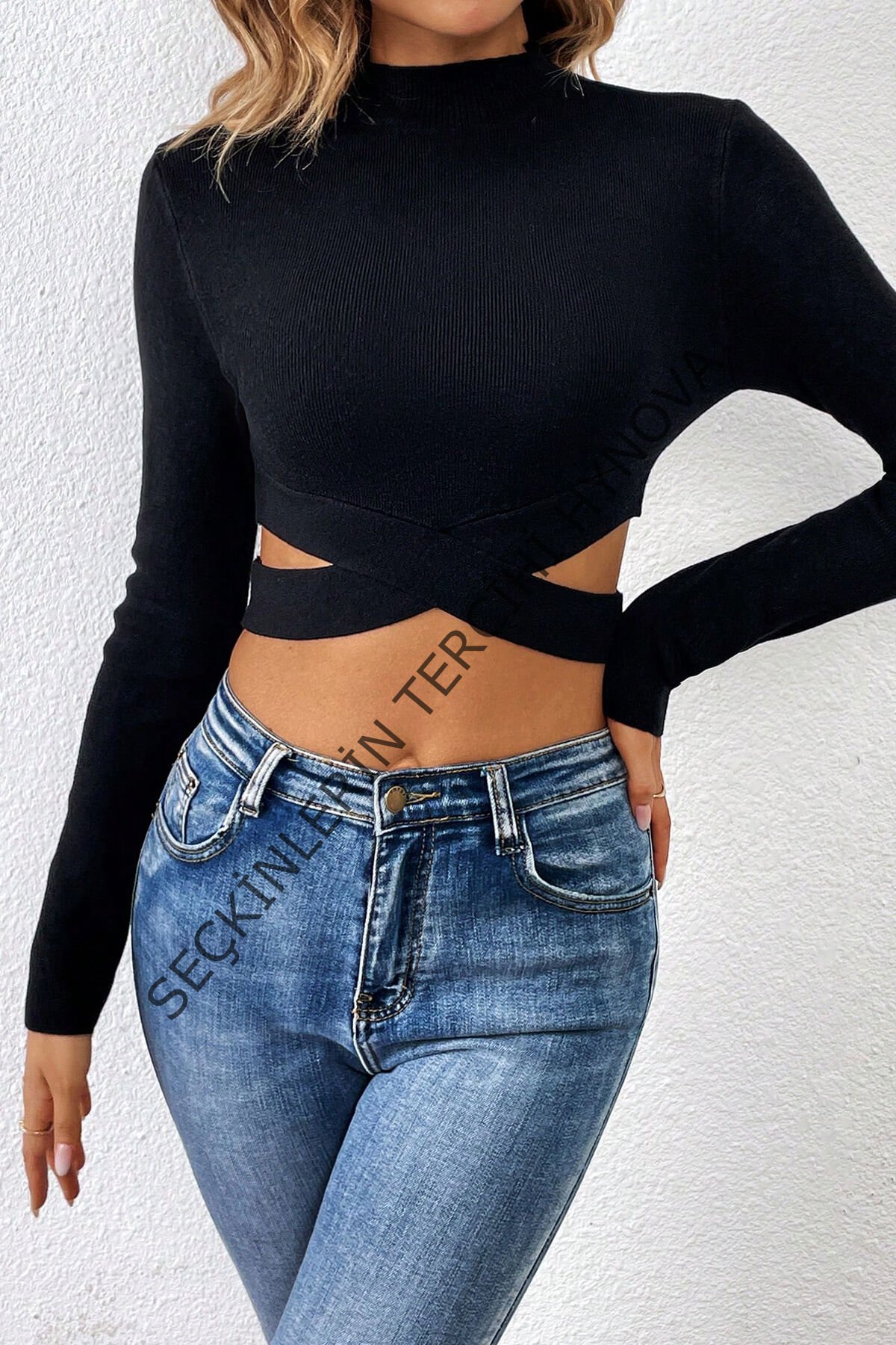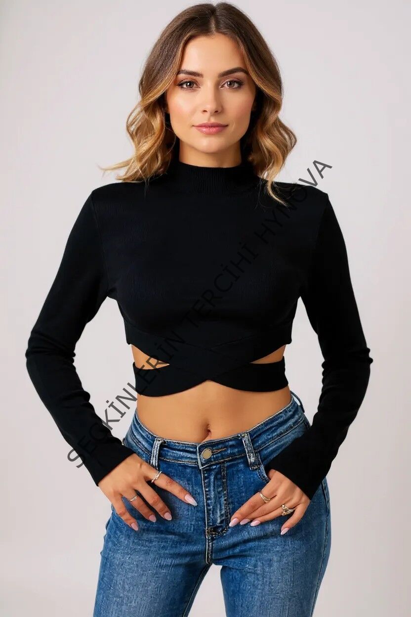 Kadın Siyah Çapraz Bel Detaylı Dik Yaka Uzun Kol Crop Top Bluz – Şık, Rahat ve Kolay Kombinlenebilir