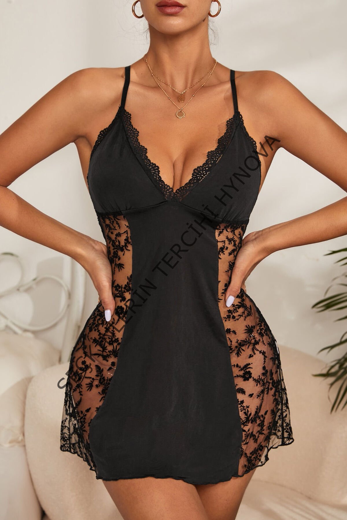 Kadın Siyah Çapraz Sırt Dekolteli Transparan Dantel Gecelik