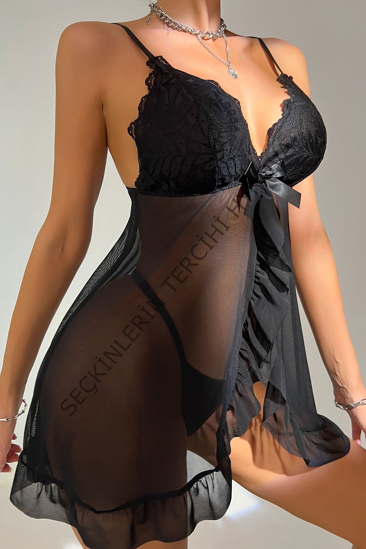 Kadın Siyah Dantelli, Fırfırlı Tül ve Fiyonk Detaylı Tangalı Gecelik Takımı