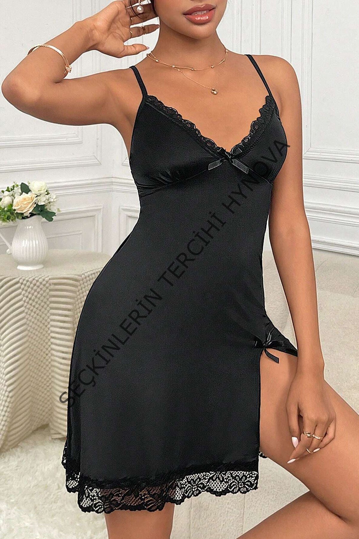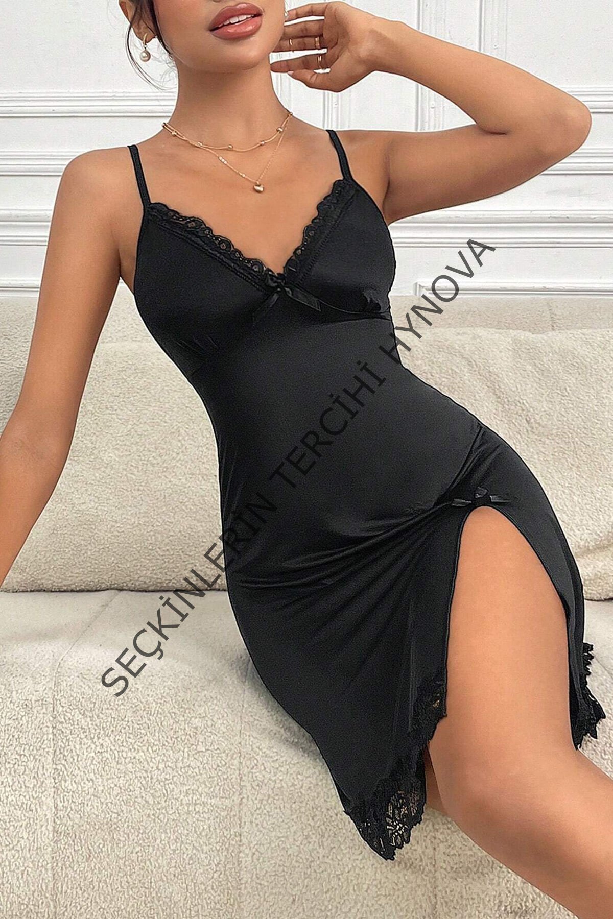 Kadın Siyah Dantelli Fiyonklu ve Yırtmaçlı Şık Gecelik – Modern ve Şık Tasarım