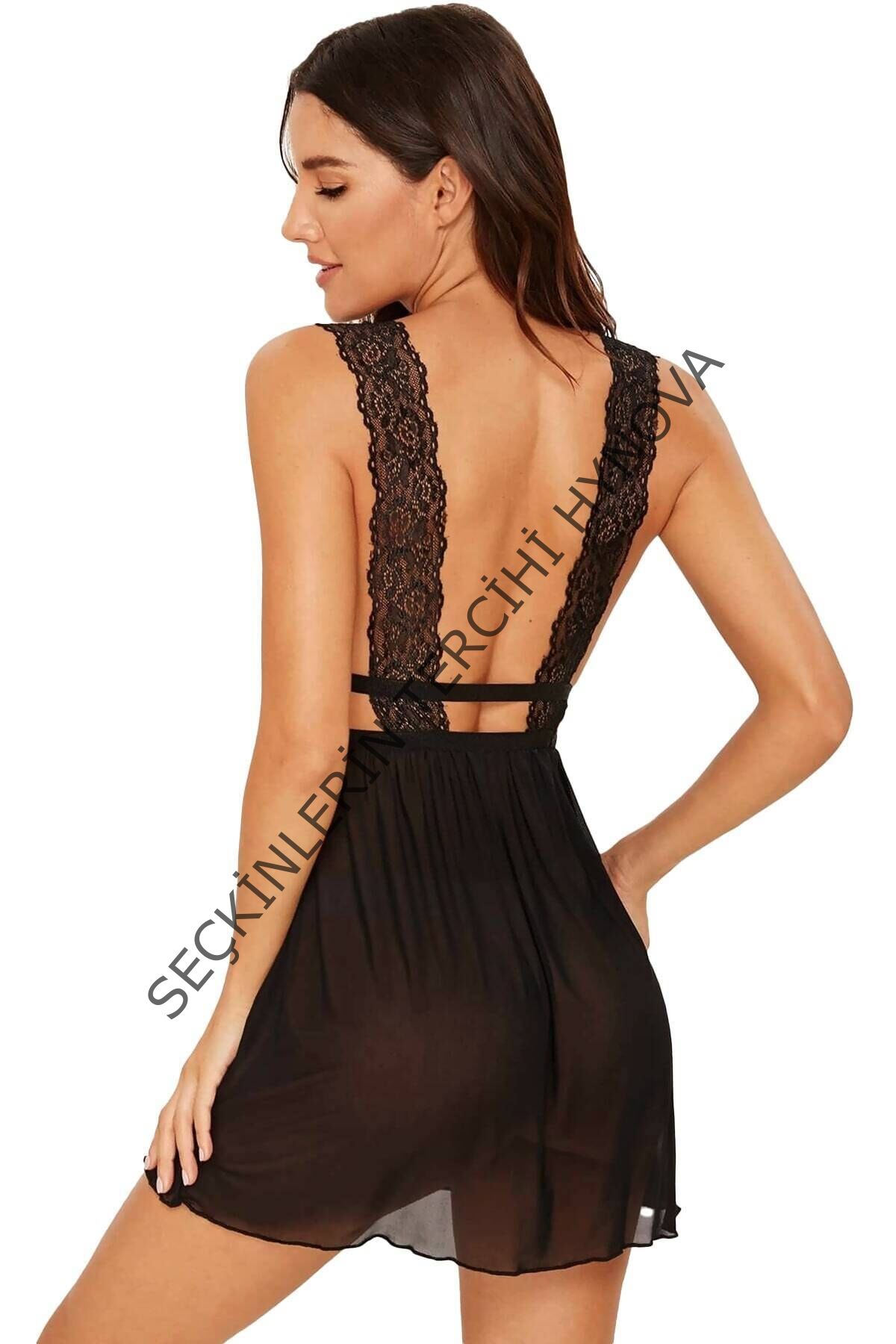 Kadın Siyah Dantelli Sırtı Açık Gecelik – Modern ve Şık Tasarım