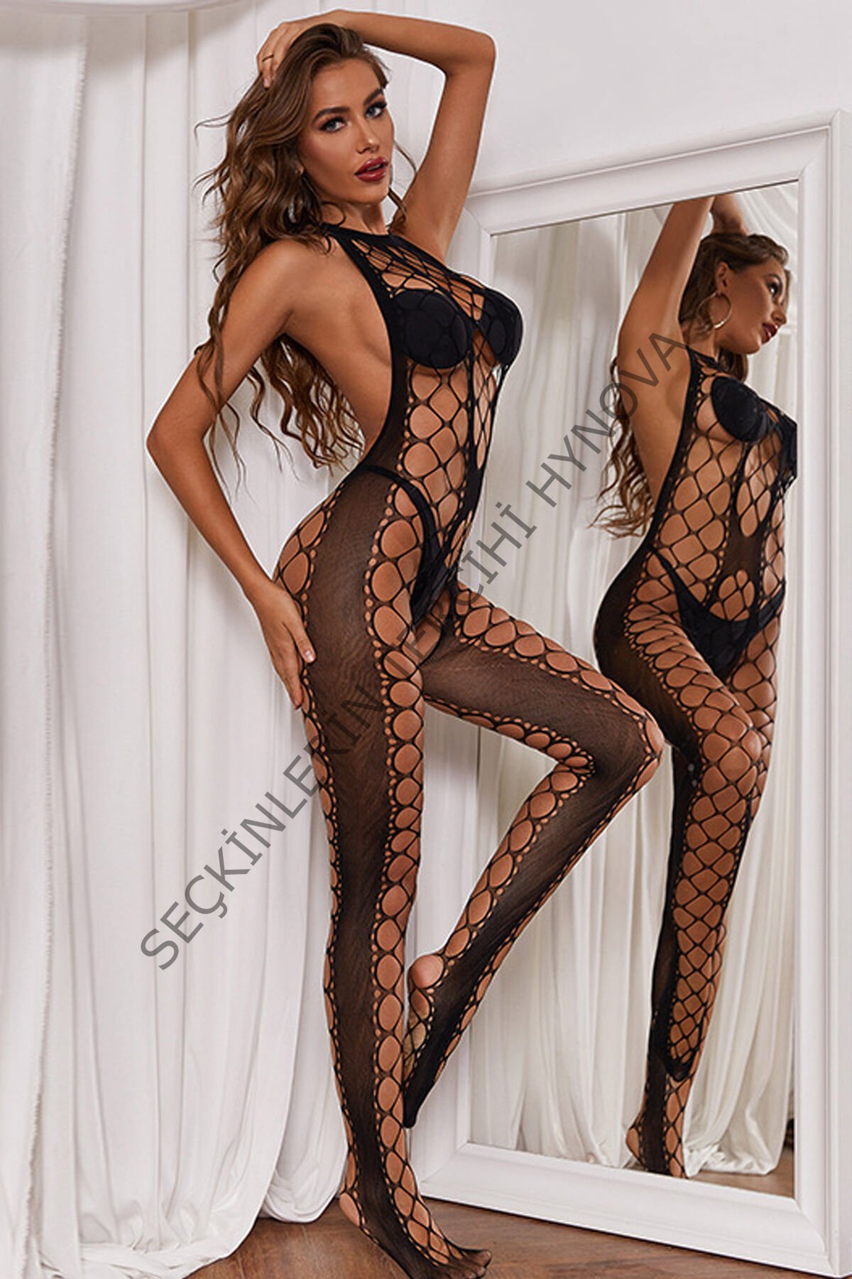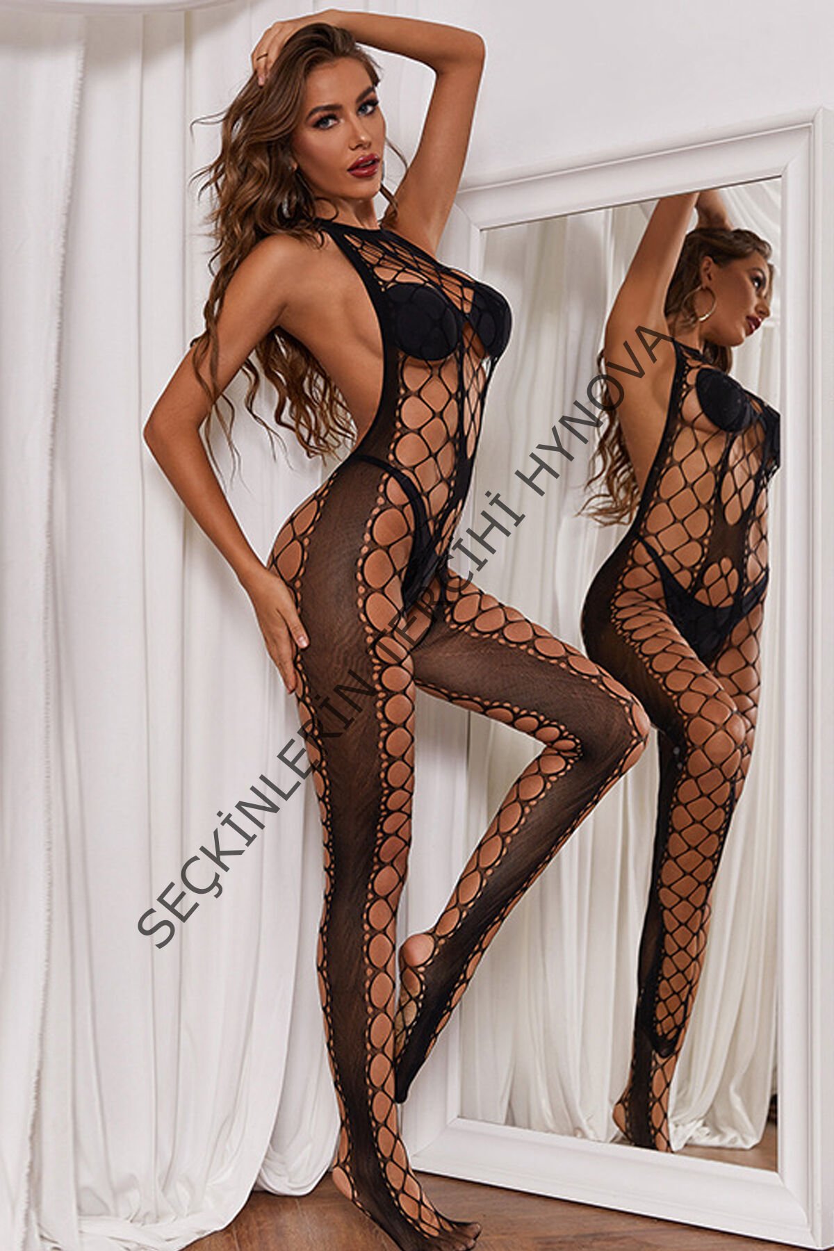 Kadın Siyah Geniş File Detaylı Seksi Fantezi Vücut Çorabı – Modern ve Şık Tasarım