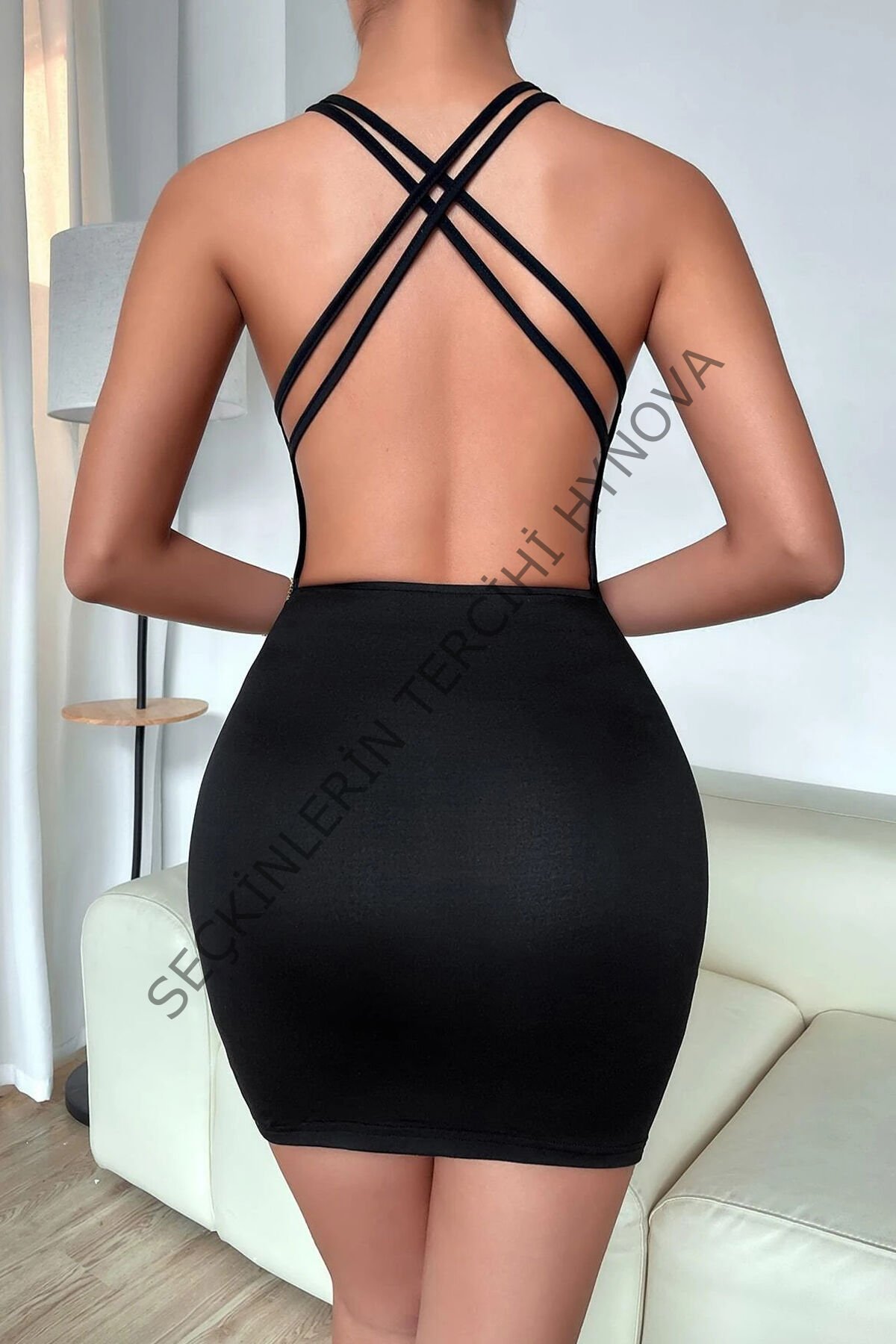 Kadın Siyah Göbek Dekolteli Çapraz Sırt Detaylı Gecelik – Modern ve Şık Tasarım