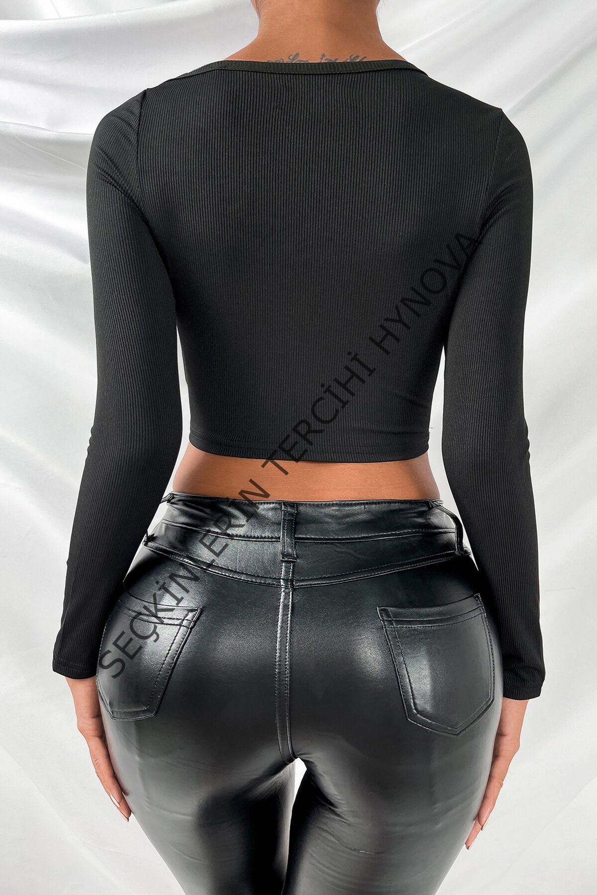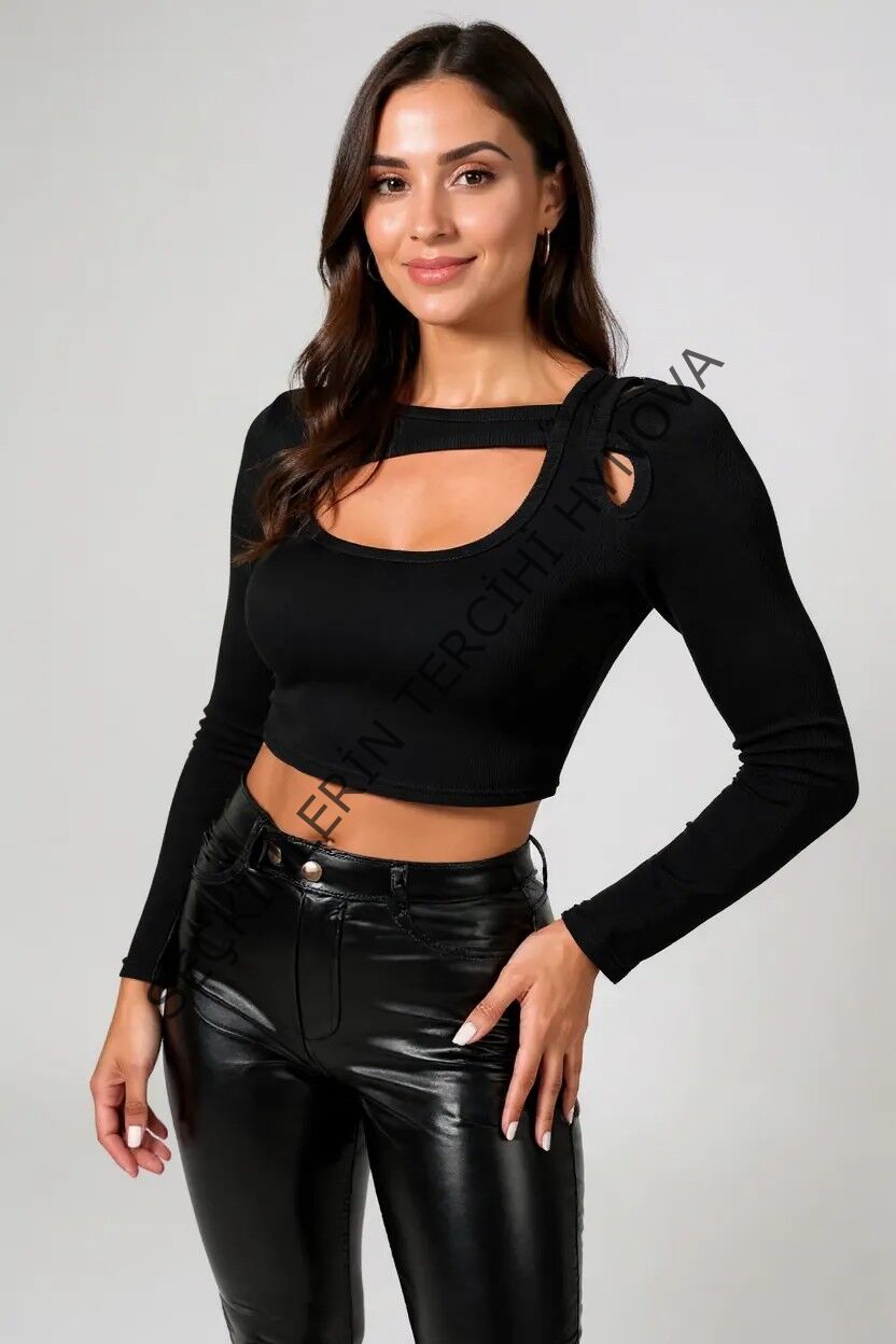 Kadın Siyah Göğüs Dekolteli Çapraz Askılı Uzun Kollu Crop Top Bluz – Şık, Rahat ve Kolay Kombinlenebilir