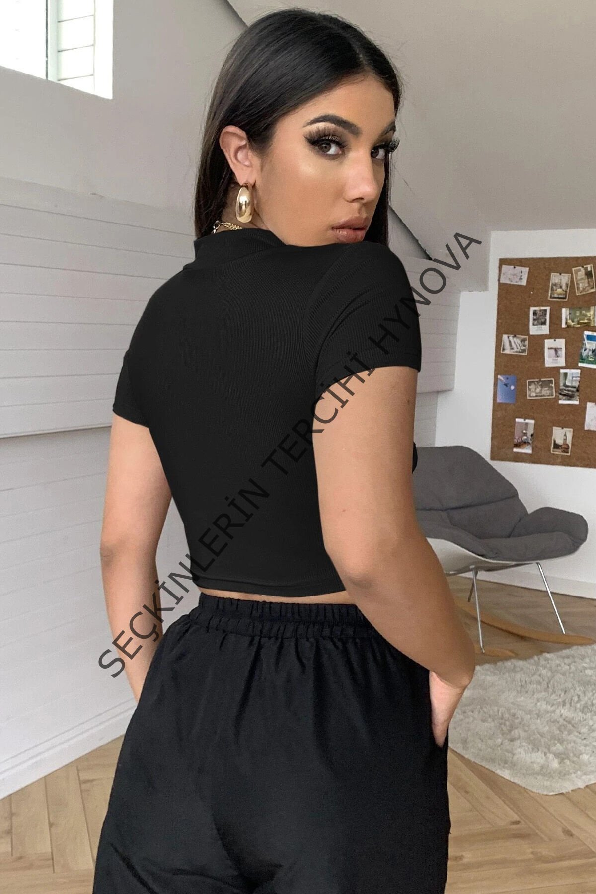 Kadın Siyah Göğüs Dekolteli Yarım Kollu Cut Out Crop Top Bluz – Şık, Rahat ve Kolay Kombinlenebilir