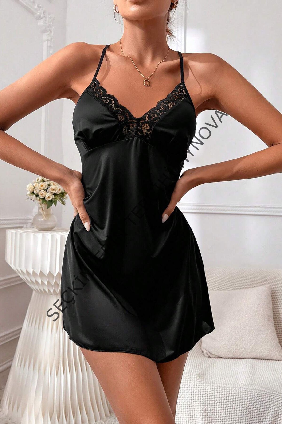 Kadın Siyah Göğüs ve Sırt Kısmı Dantel Detaylı Özel Gecelik – Modern ve Şık Tasarım