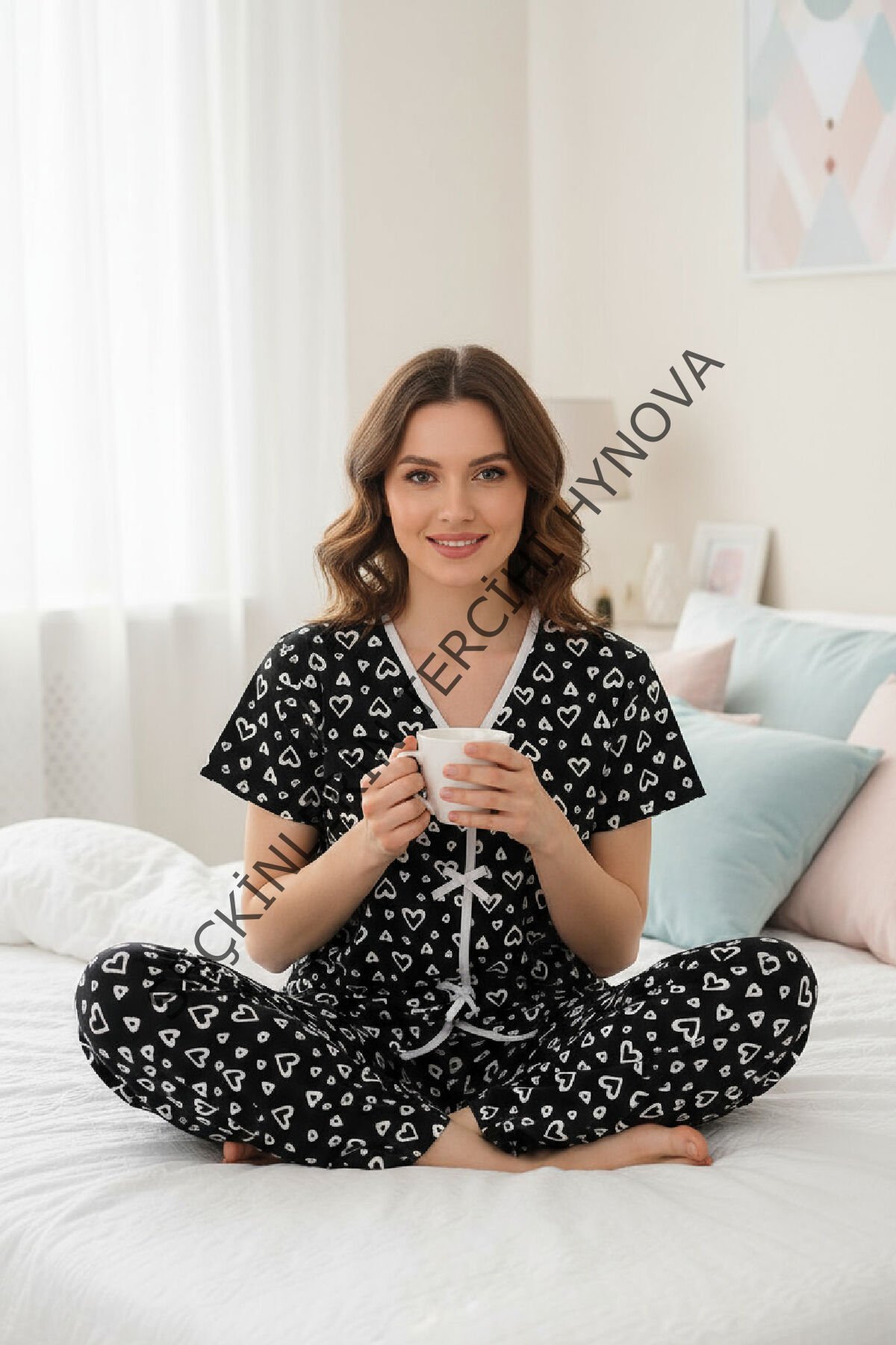 Kadın Siyah Kalp Desenli Fiyonklu Kısa Kollu Uzun Pijama Takımı