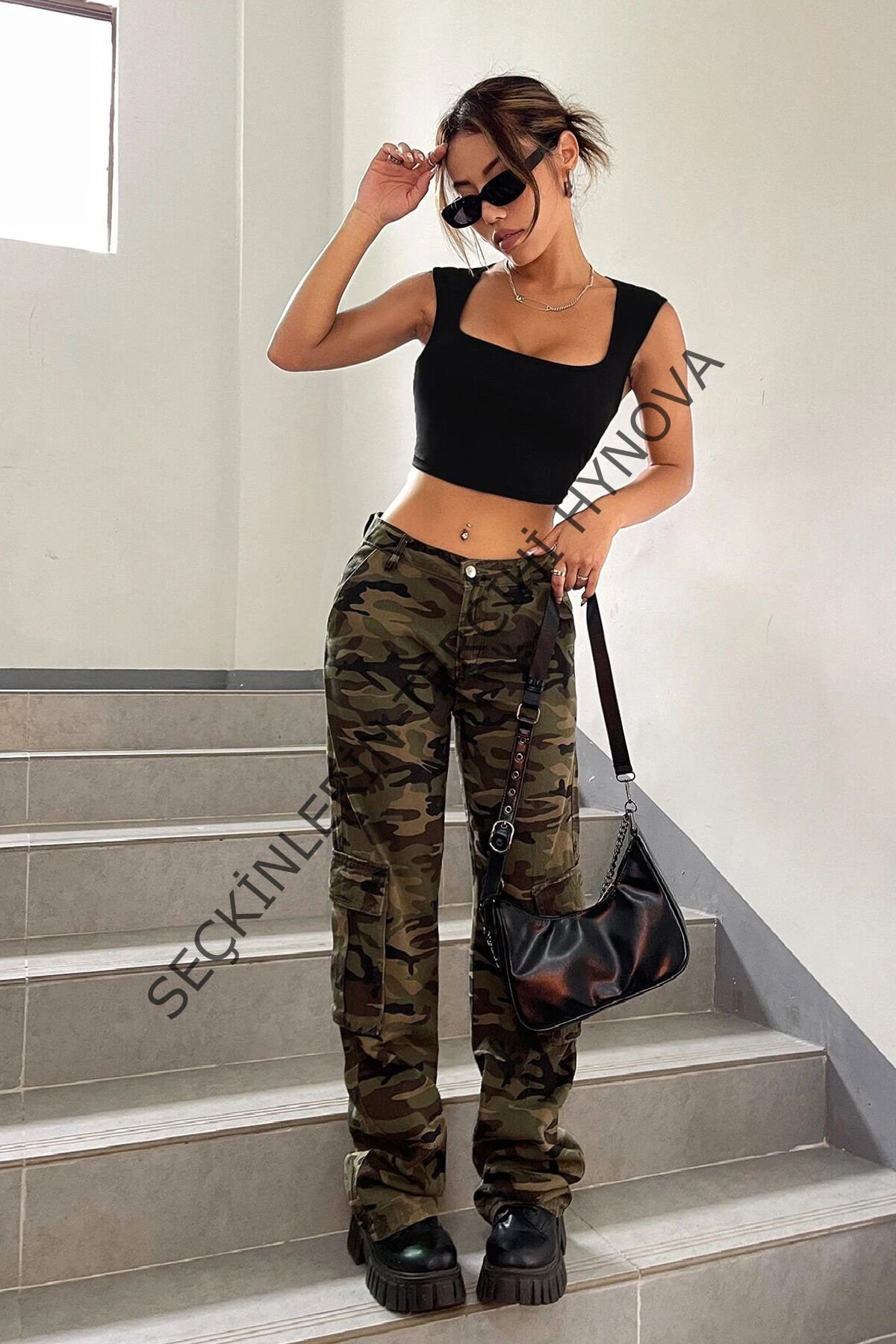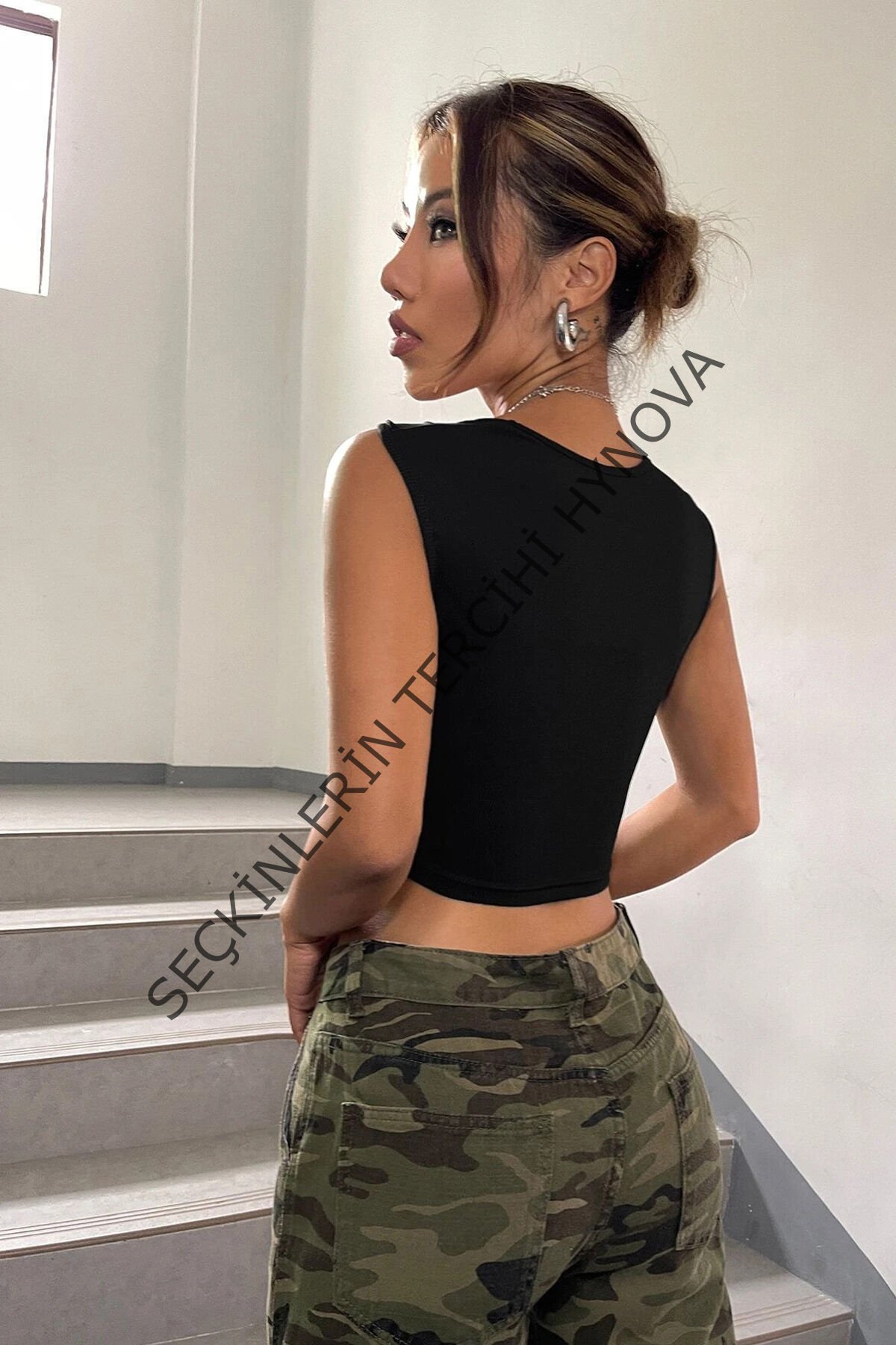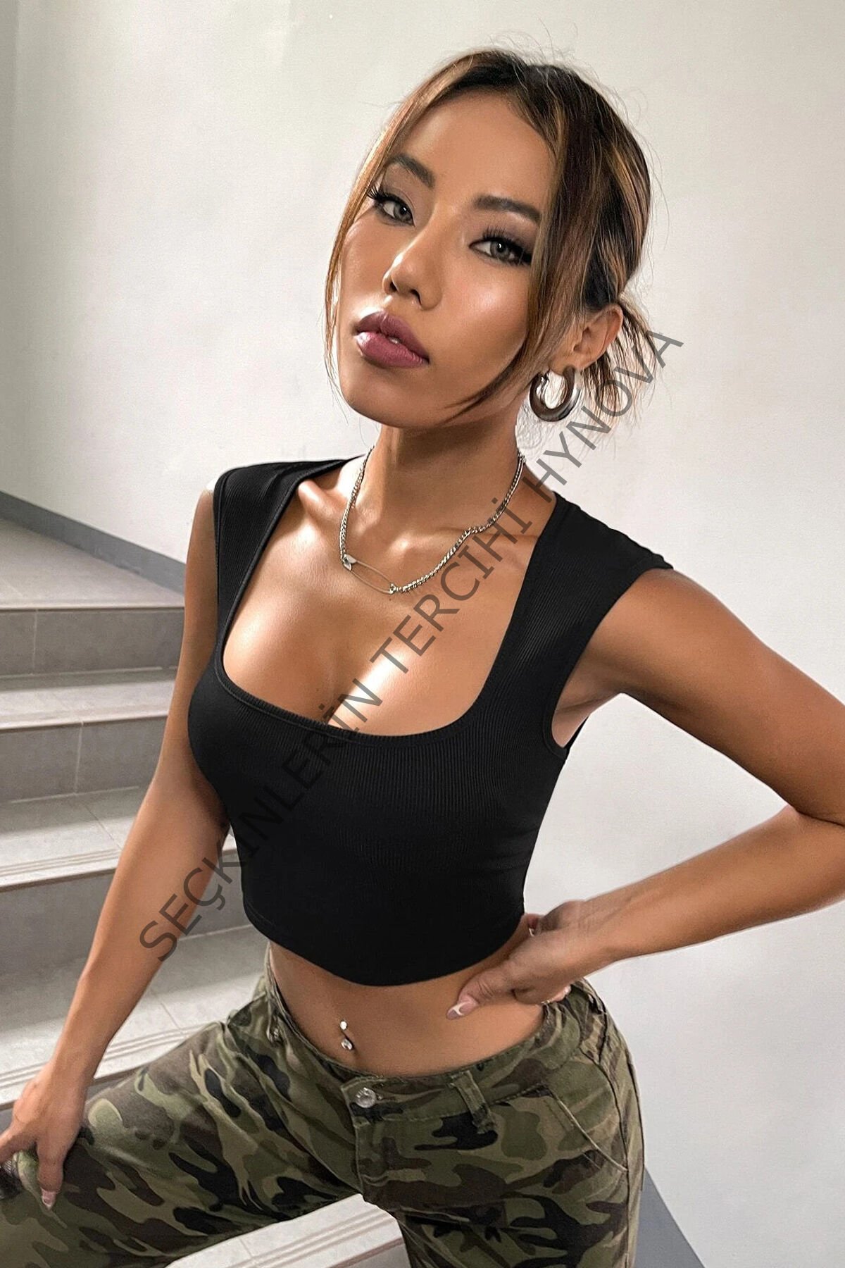 Kadın Siyah Kare Yaka Kalınlaşan Omuz Detaylı Crop Top Bluz
