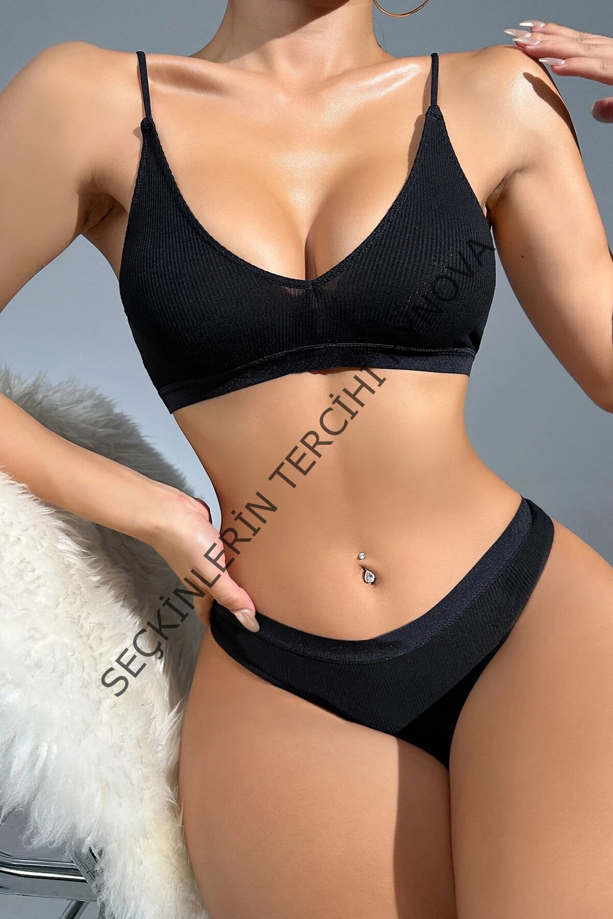 Kadın Siyah Kaşkorse Büstiyer ve Tanga Külotlu İç Çamaşır Takımı
