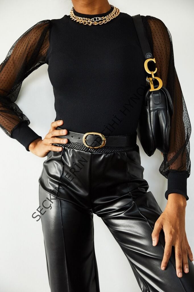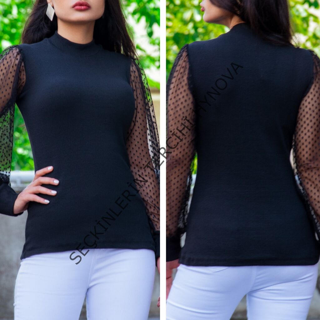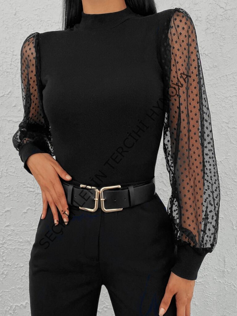 Kadın Siyah Kolu Tül Detaylı Yarım Balıkçı Kaşkorse Bluz