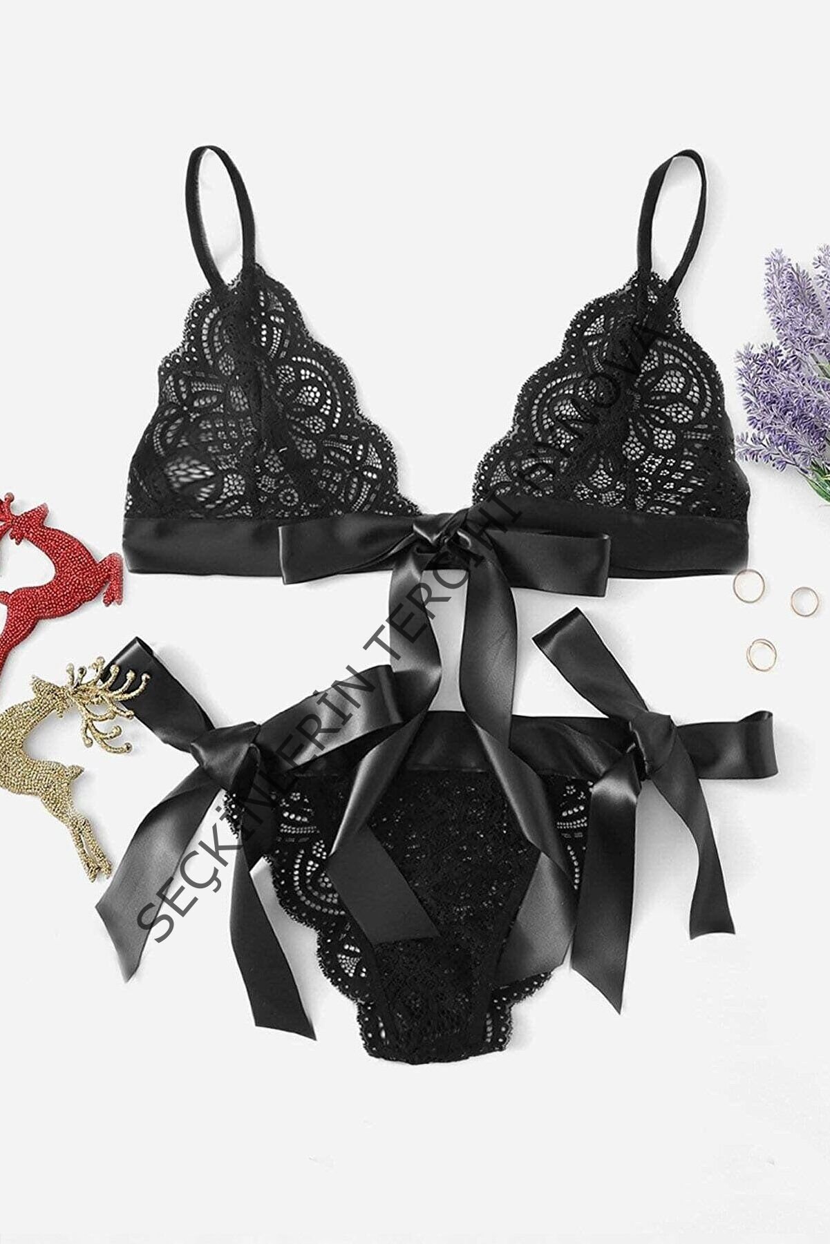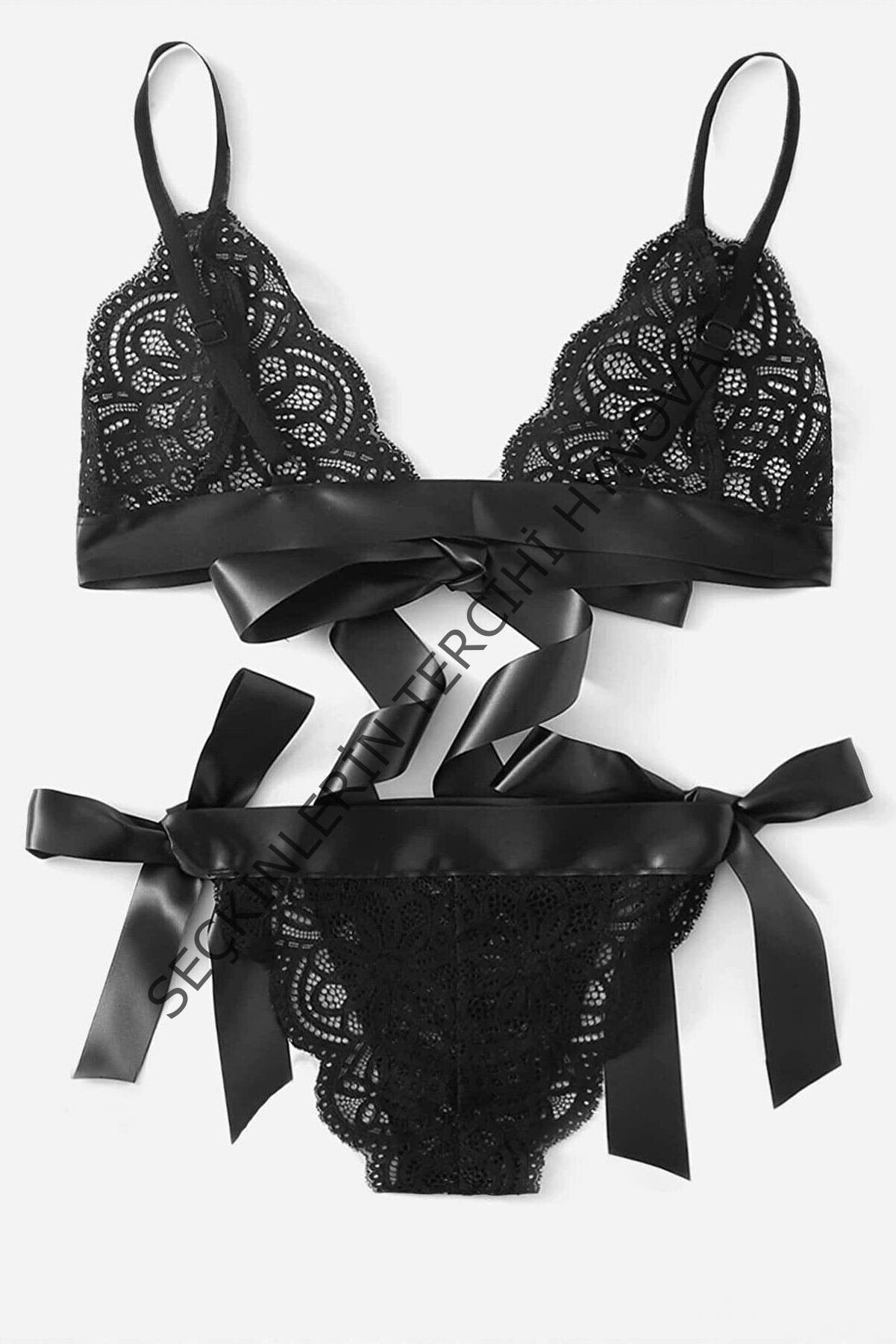 Kadın Siyah Kurdelalı Ve Dantelli Sütyen Külot Takımı – Modern, Konforlu ve Günlük Kombinlere Uygun
