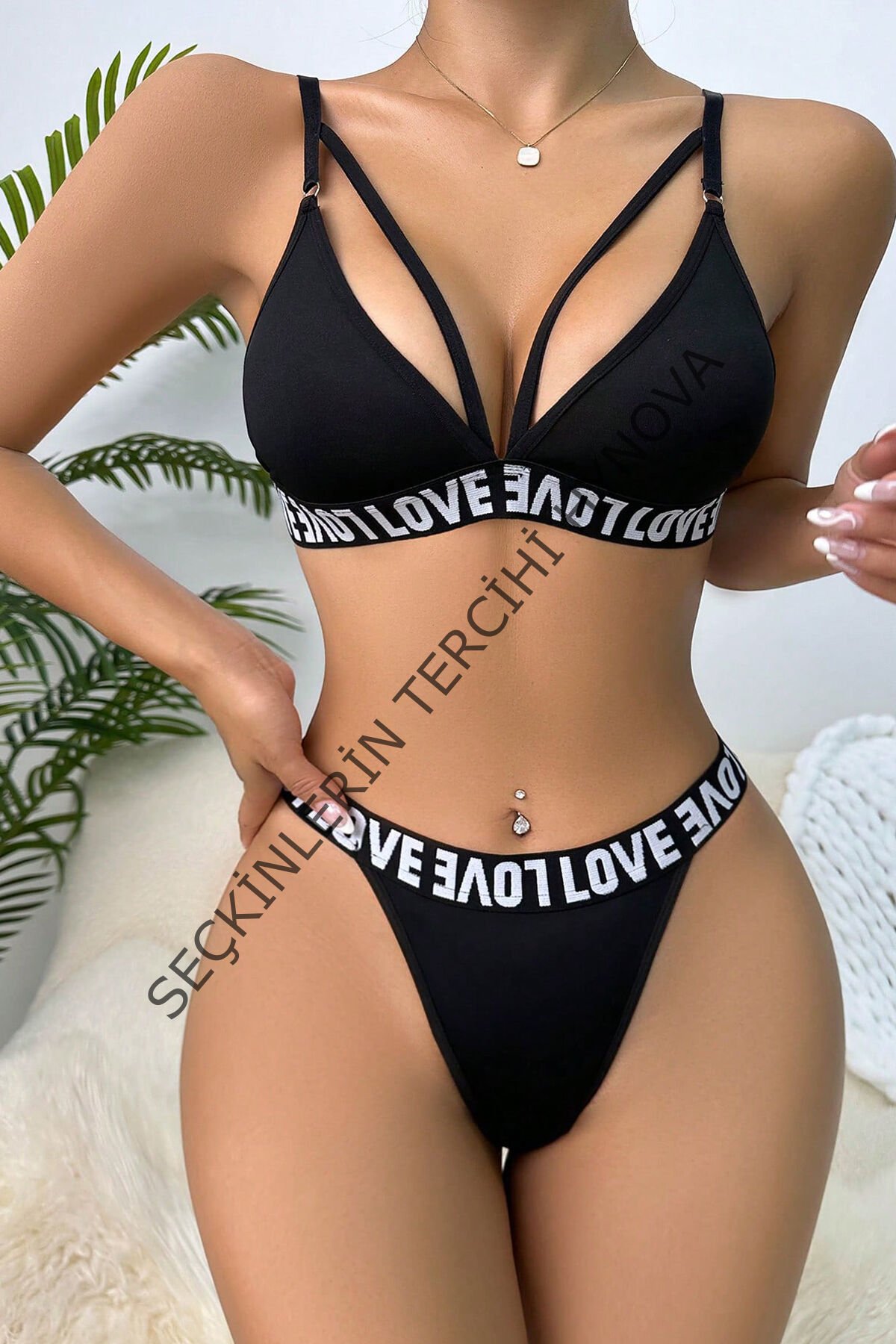 Kadın Siyah Love Yazı Detaylı Harness İç Çamaşır Takımı – Modern, Konforlu ve Günlük Kombinlere Uygun