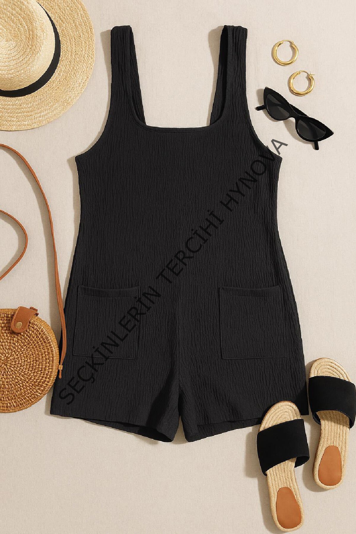 Kadın Siyah Mini Cepli Tulum Plaj Elbisesi – Şık, Rahat ve 4 Mevsim Kullanıma Uygun