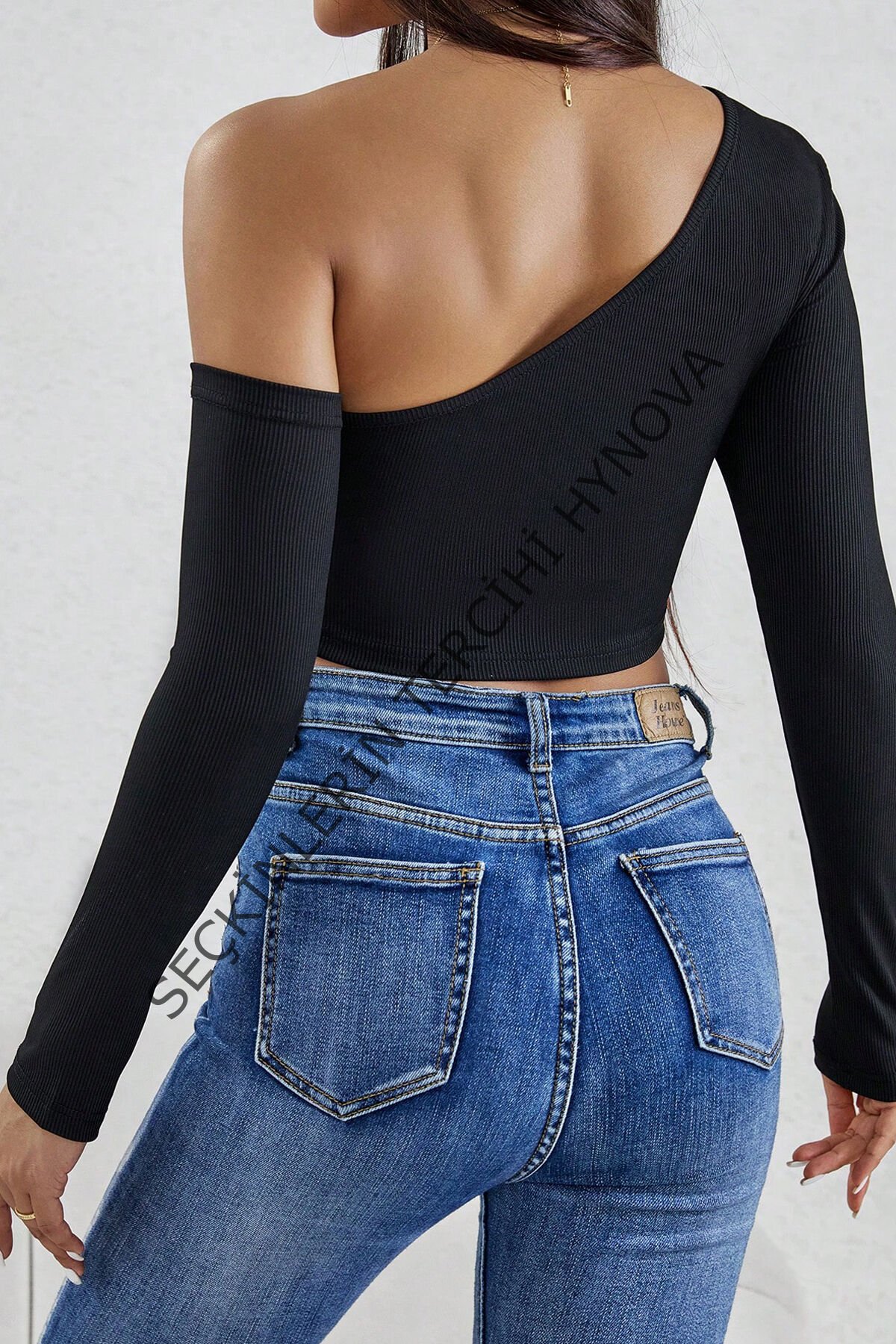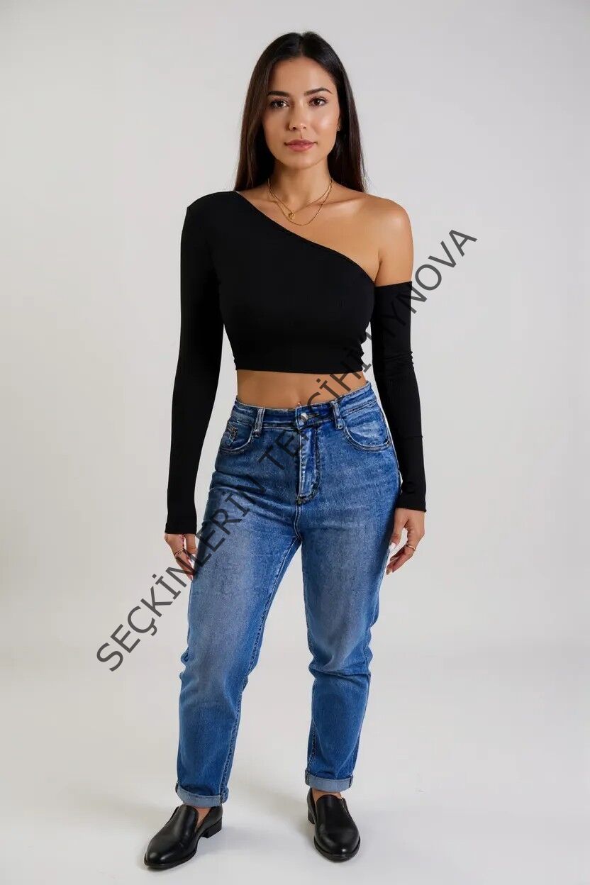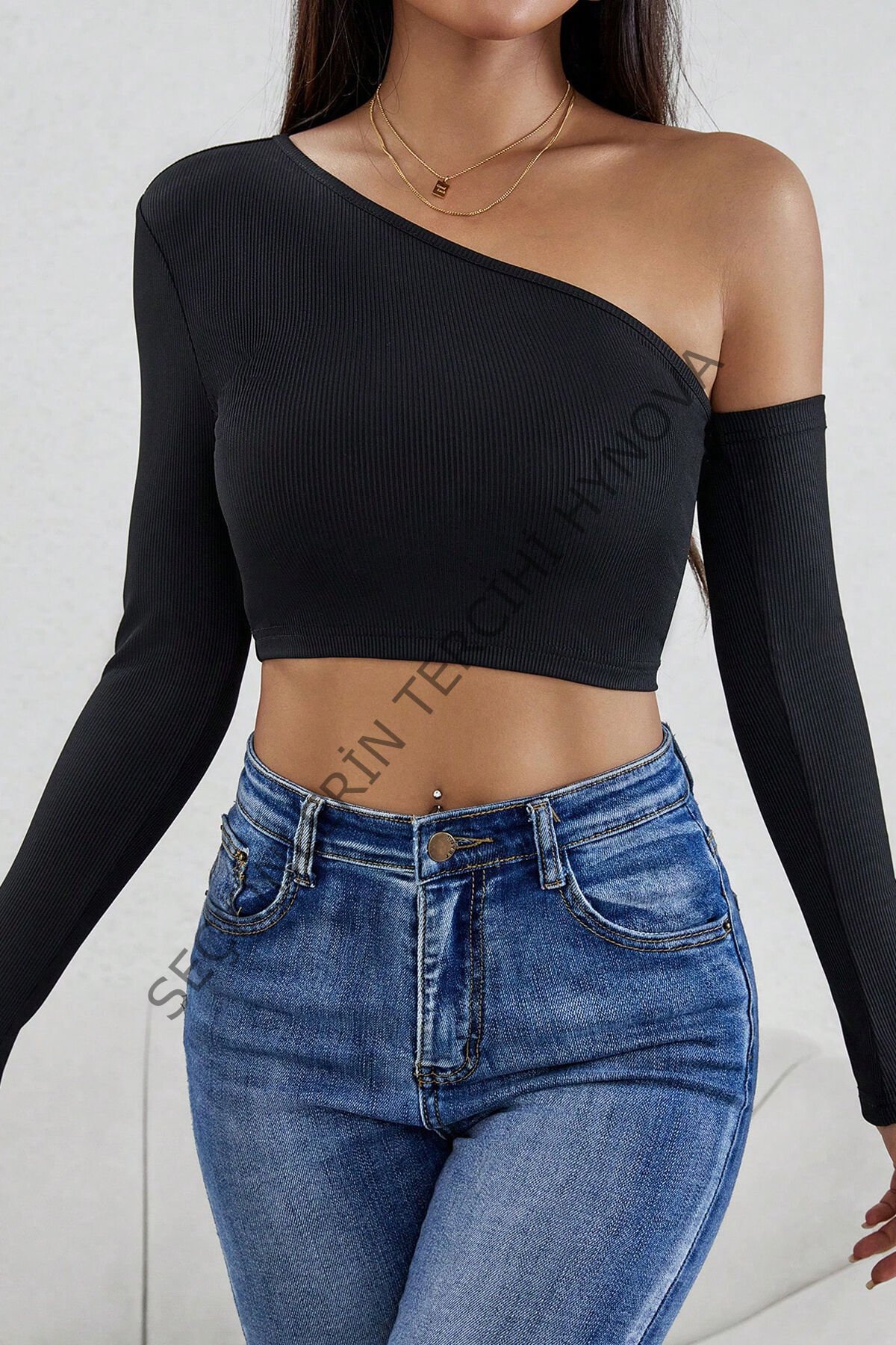 Kadın Siyah Tek Omuz Detaylı Uzun Kol Crop Top Bluz – Şık, Rahat ve Kolay Kombinlenebilir