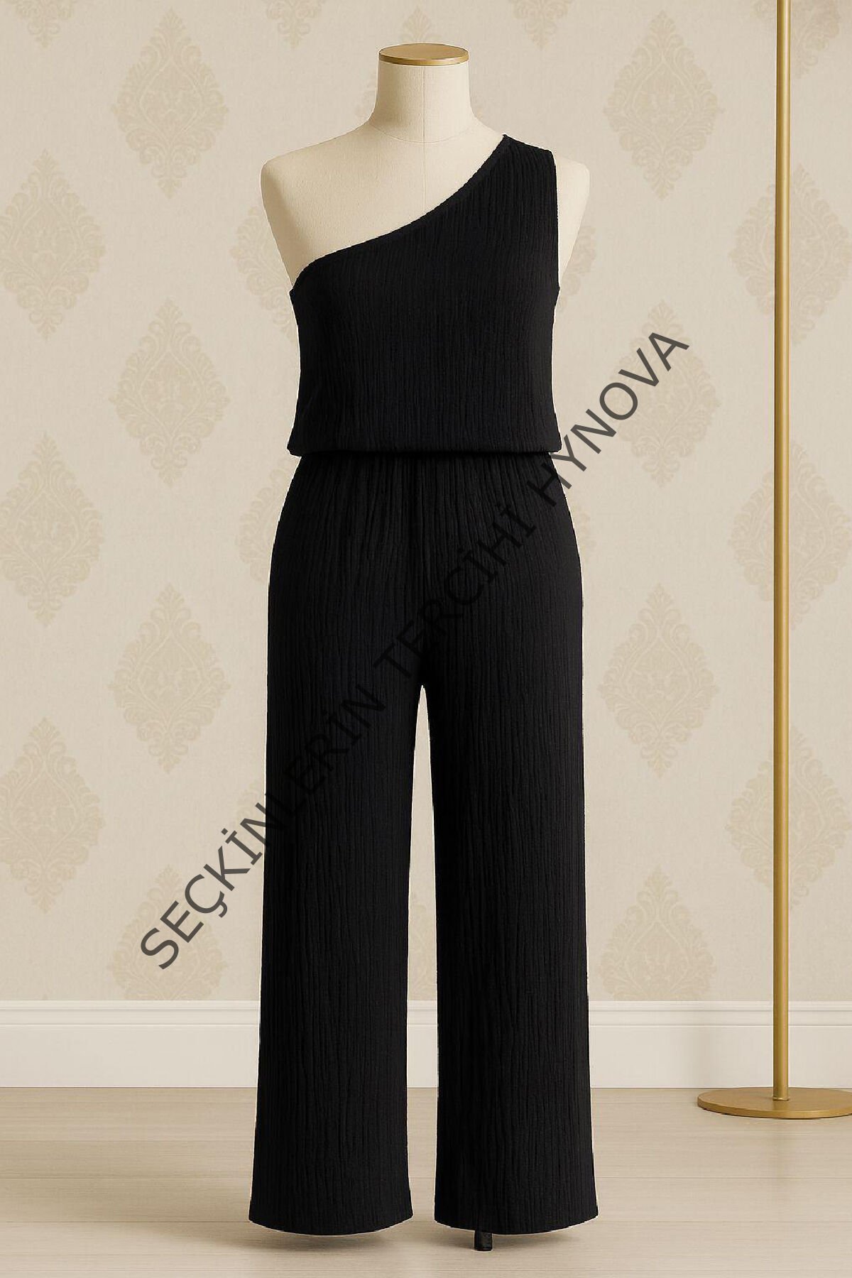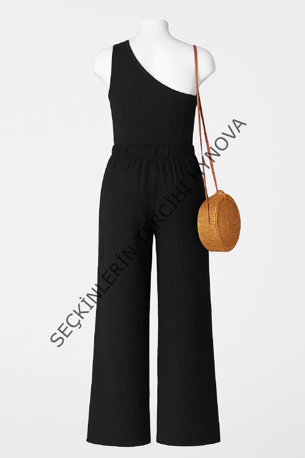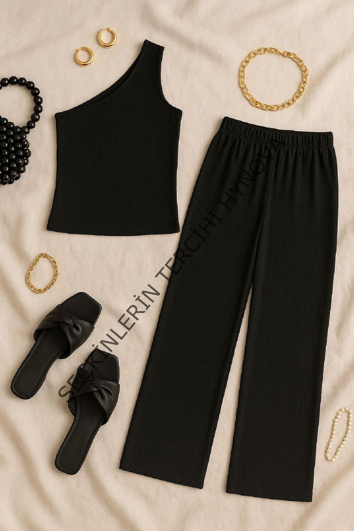- Kadın siyah tek omuzlu bluz ve geniş paça pantolon ikili takım, şıklığı ve rahatlığı aynı anda yaşamak isteyen kadınlar için ideal bir