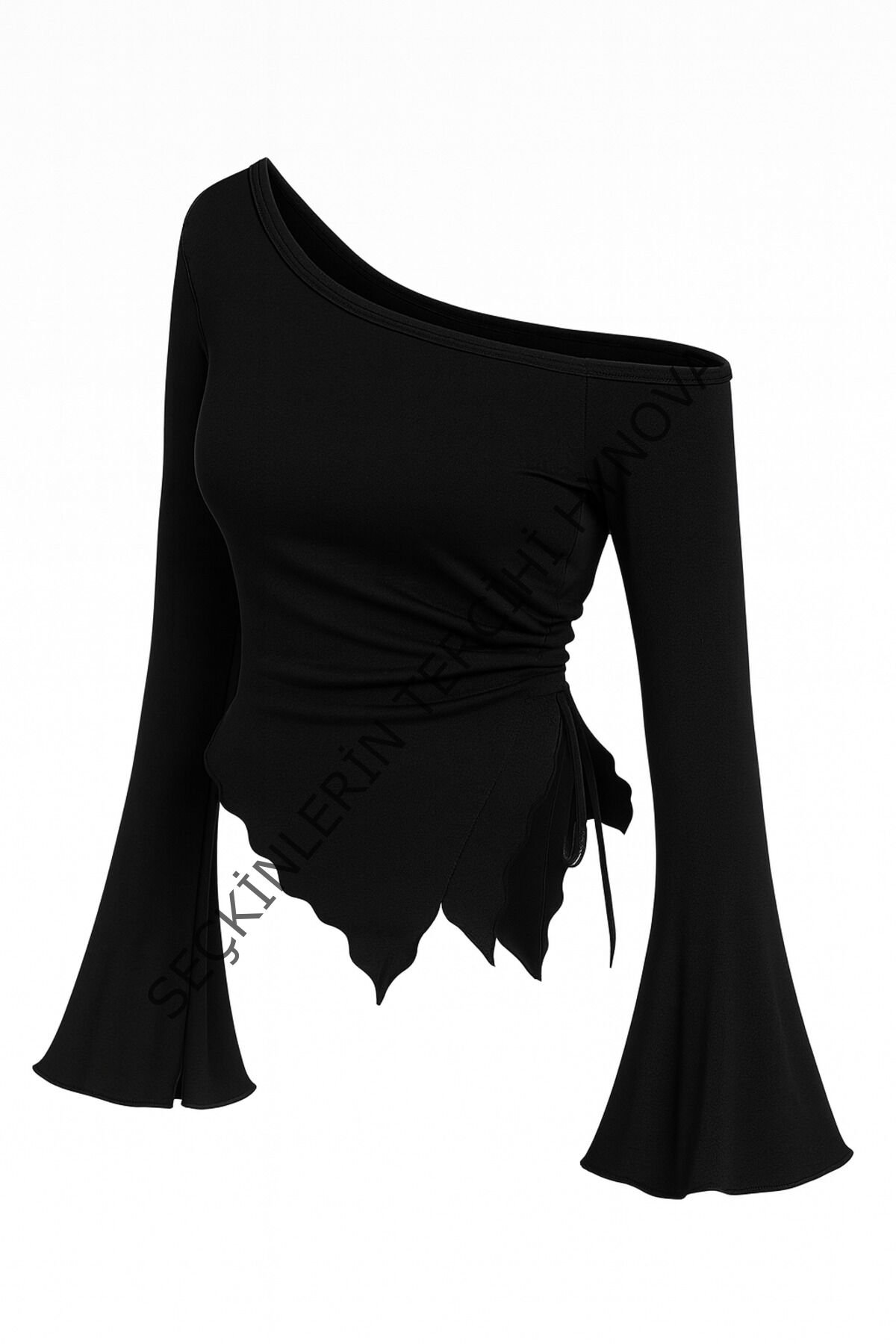 Kadın Siyah Uzun İspanyol Kollu Asimetirik Yaka Yandan Bağlamalı Drapeli Bluz