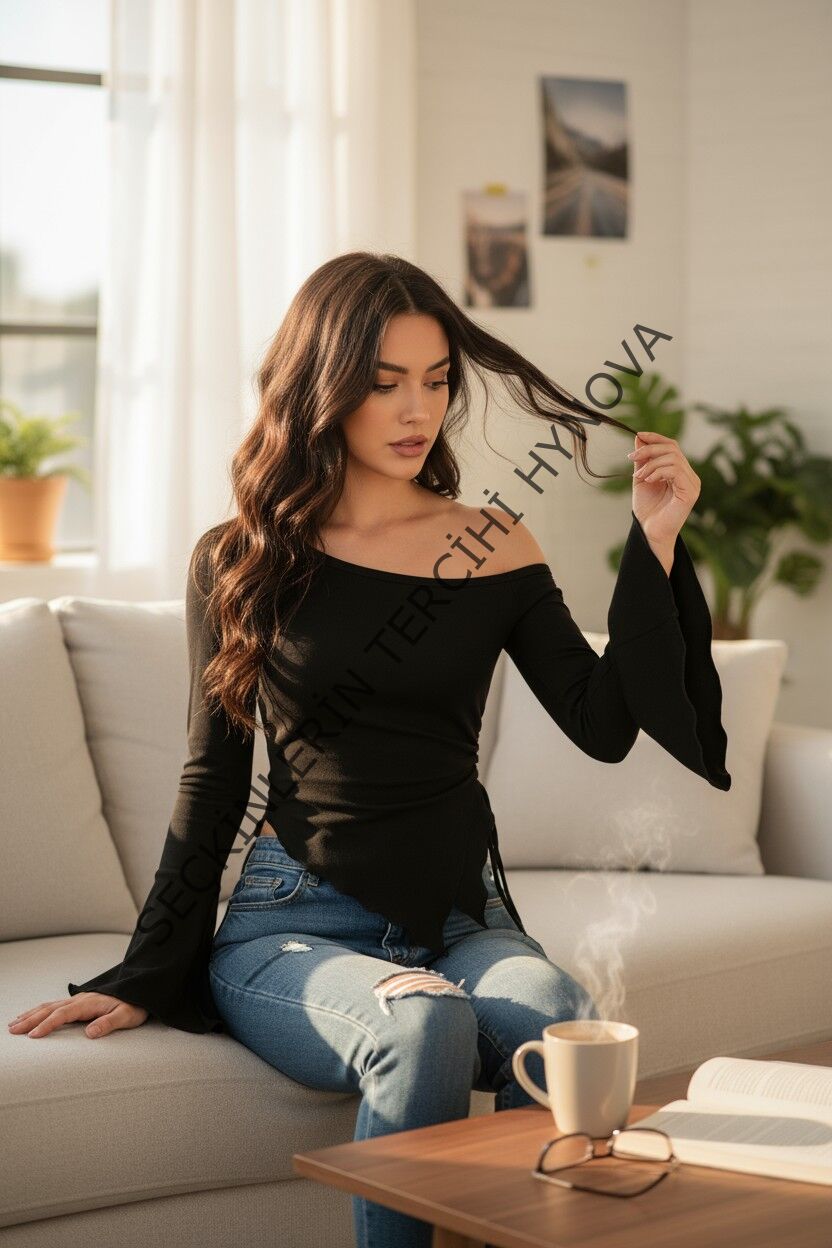 - Modern çizgilerle tasarlanmış Kadın Siyah Asimetrik Yaka Drapeli Yan Bağlamalı Uzun Kollu Bluz, sade ama etkileyici tarzıyla dikkat çeken bir parça.