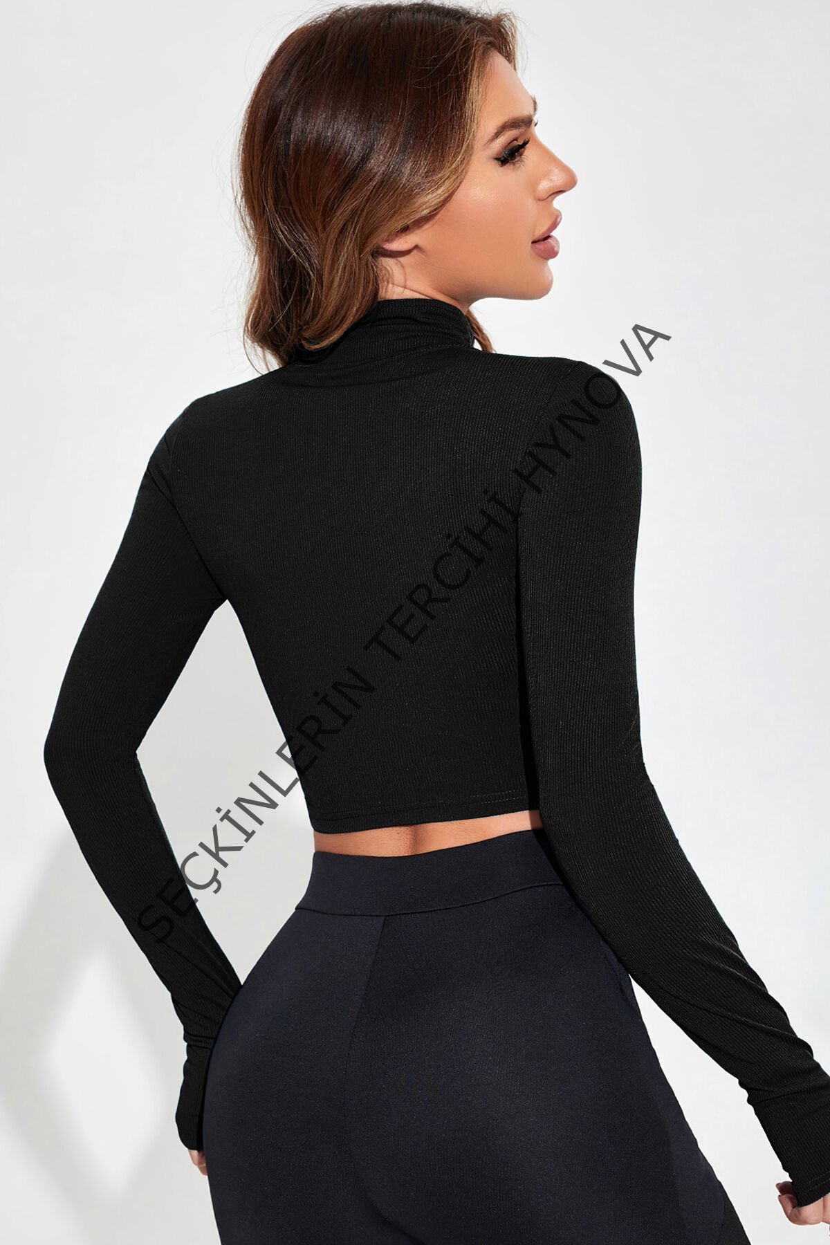 Kadın Siyah Uzun Kol Fermuarlı Parmak Geçme Detaylı Dik Yaka Crop Top Bluz