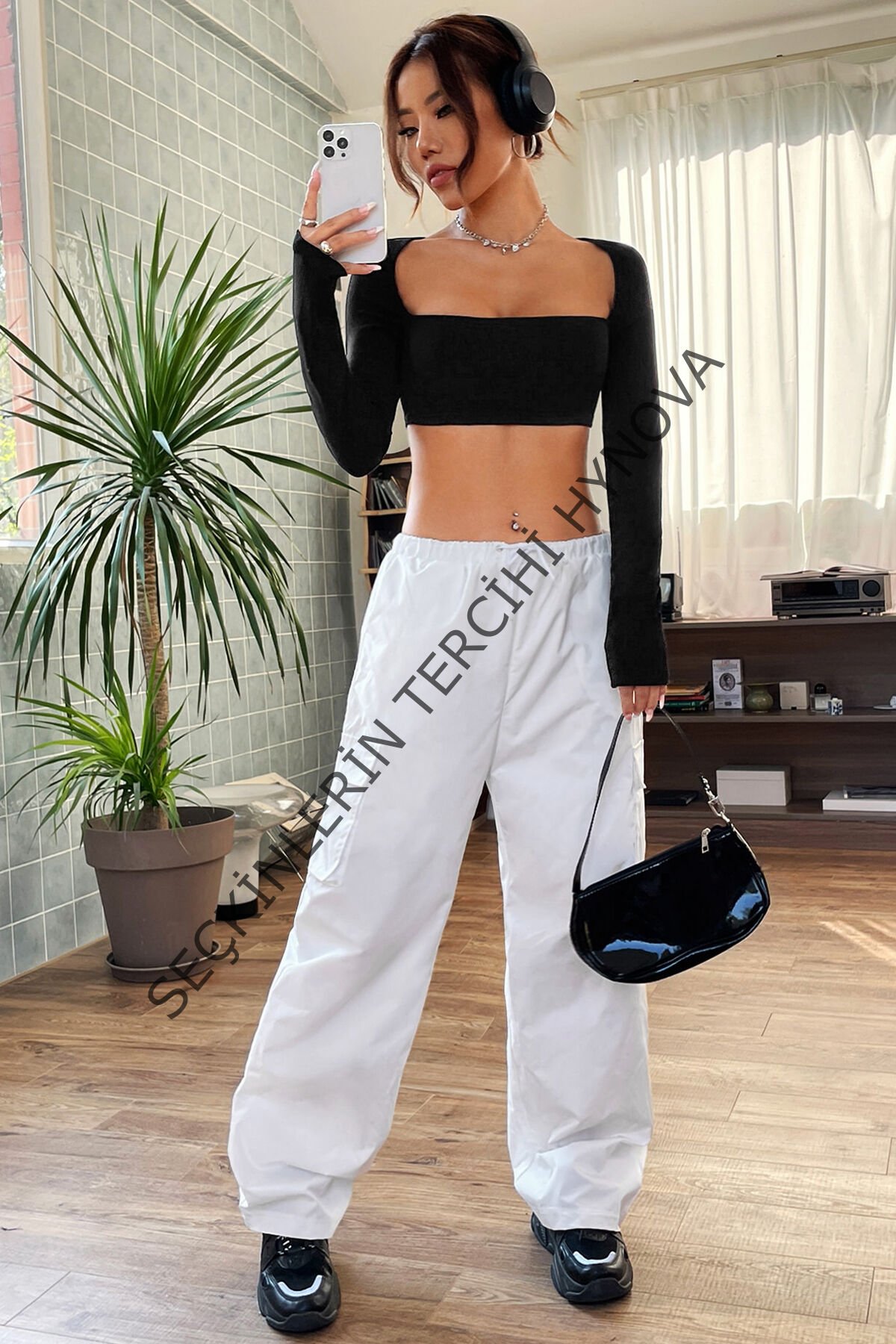 Kadın Siyah Uzun Kol Göğüs ve Sırt Dekolteli Crop Top Bluz – Şık, Rahat ve Kolay Kombinlenebilir