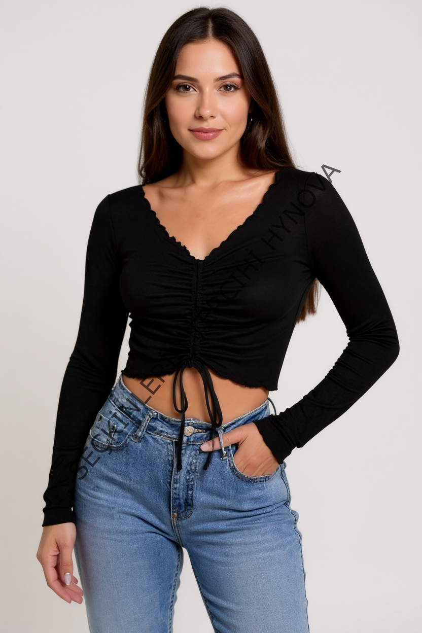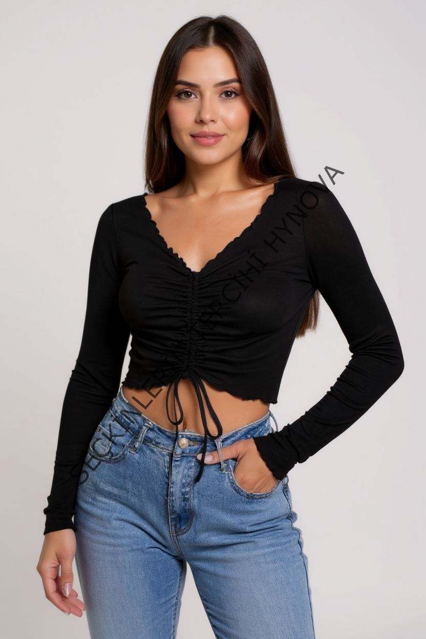 Kadın Siyah Uzun Kollu Büzdürme Bağcık Detaylı Crop Top Bluz – Şık, Rahat ve Kolay Kombinlenebilir