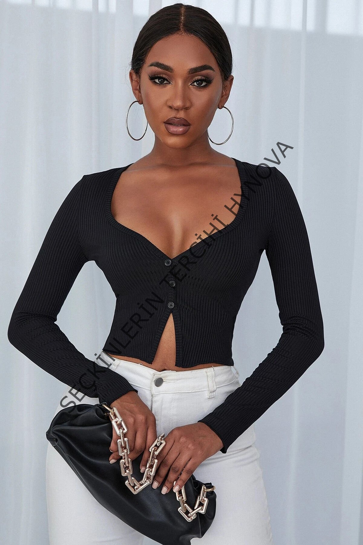 Kadın Siyah Uzun Kollu Düğmeli Göğüs ve Göbek Dekolteli Crop Top Bluz – Şık, Rahat ve Kolay Kombinlenebilir